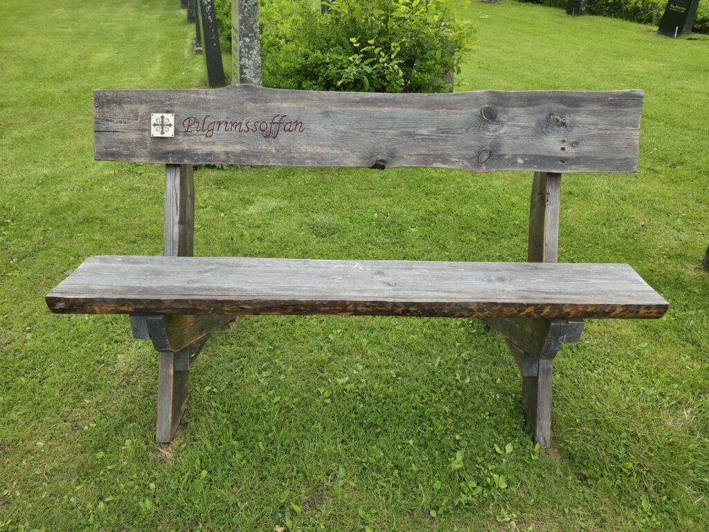 Pilgrimssofaen, hvilebenk for slitne pilgrimer ved Duved kirke. Turen fra Sundsvall til Trondheim er på 580 kilometer. Det tar litt over en måned å gå hele distansen