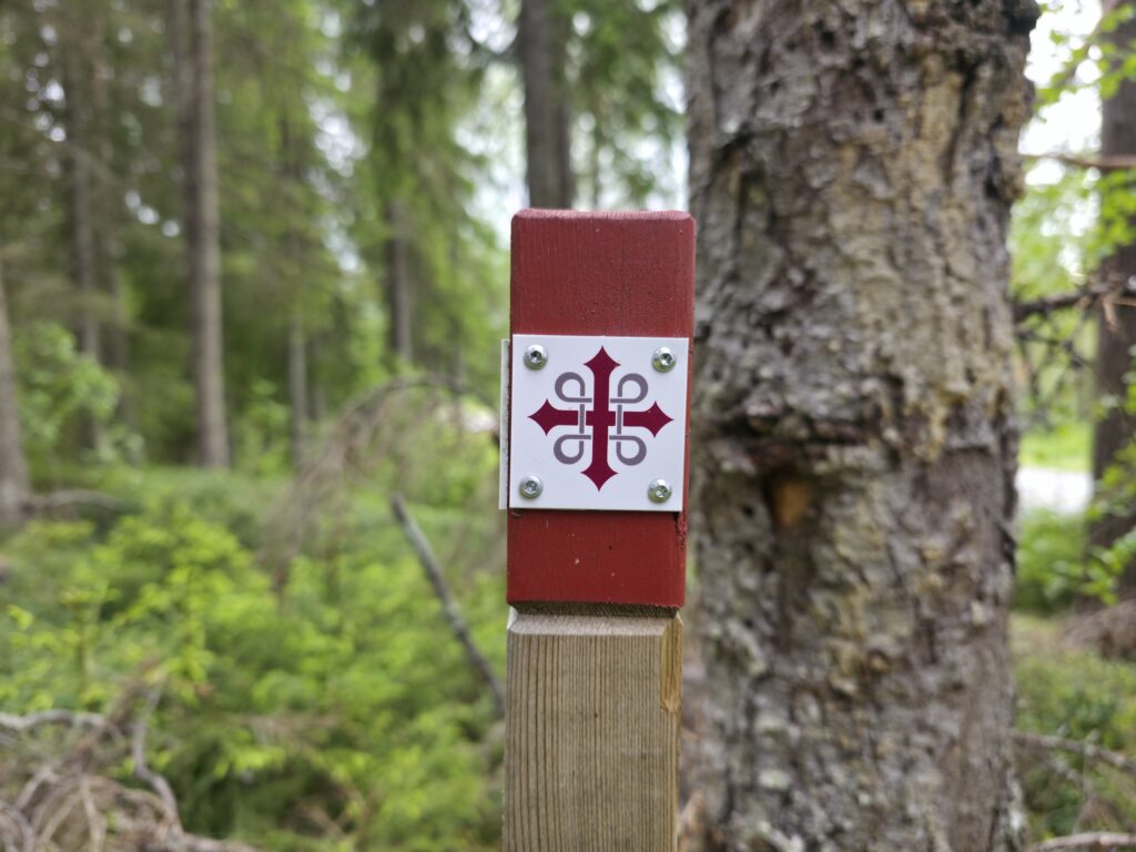 Merkestolper for St.Olavsleden så vi både her og der. Det gikk vandringsstier på kryss og tvers i Jämtland. Leden passerer gjennom skog, over fjell, langs innsjøer, små bygder og historiske steder. Denne stolpen sto plassert ved Semlan i Bleckåsen