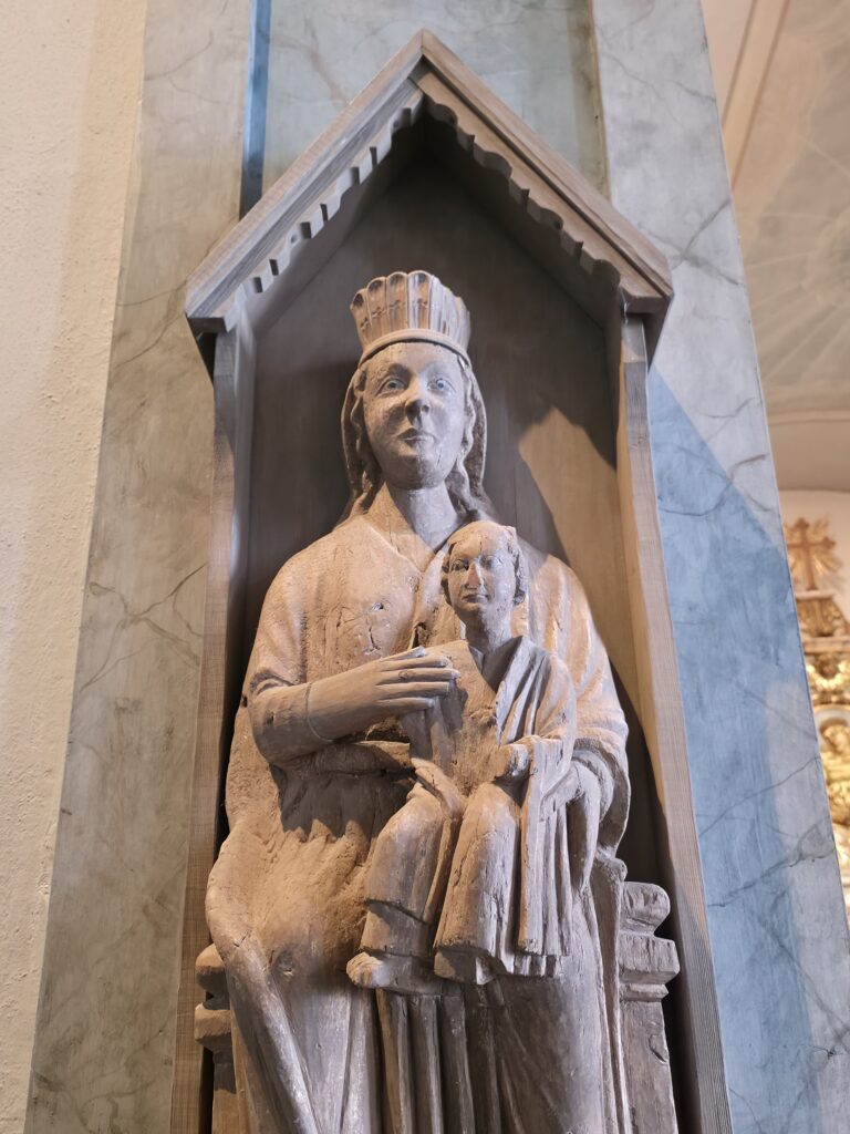 Maria med barnet. Figuren henger på nordsiden av alteret. Maria var kvinnenes helgen, og det var vanlig at kvinnene plasserte seg på samme side av kirkegangen som Maria. På andre siden av alteret henger en tilsvarende figur av hellige Olof (Olav), kirkens skytshelgen