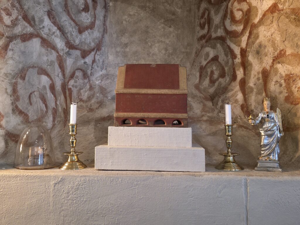 I en nisje i koret står et relikvieskrin fra 1200-tallet. Alle kirker fra middelalderen hadde et eget relikvieskrin med tilknytning til en helgen. Kirkegjengerne besøkte kirken i håp om å få ta del i helgenens kraft