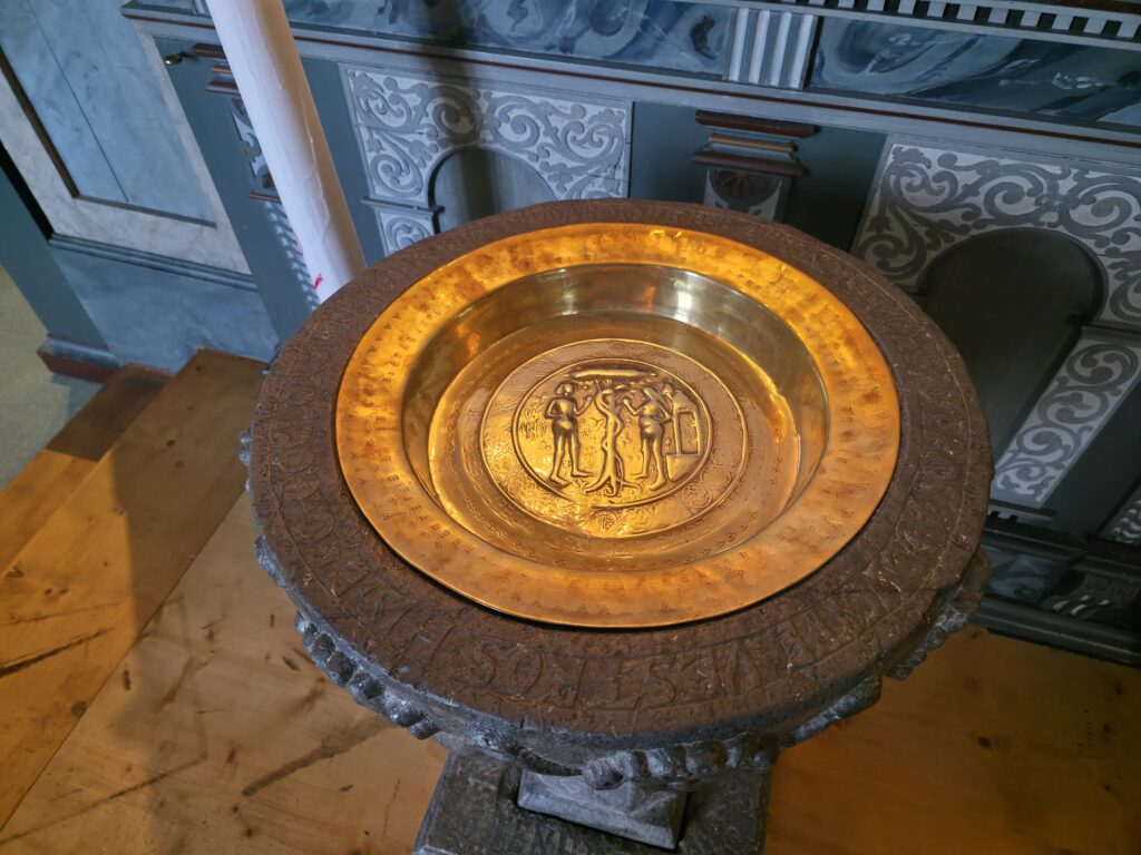 Døpefont i kalkstein fra 1698. Messingskålen i døpefonten ble laget i Nürnberg rundt 1520. En svensk soldat stjal messingskålen under et opphold i Tyskland. Han angret seg og forærte senere messingsskålen til Frøsø kirke. Messingskålen er vanligvis ikke i bruk, men ble hentet fram til ære for gjestene fra Norge