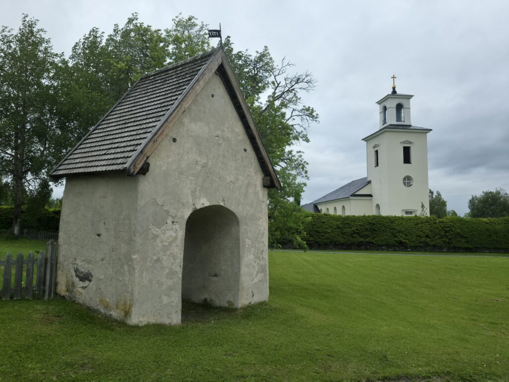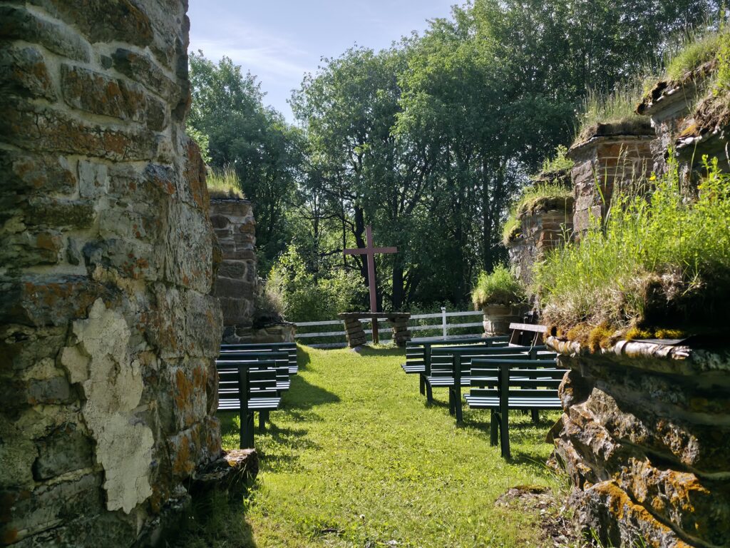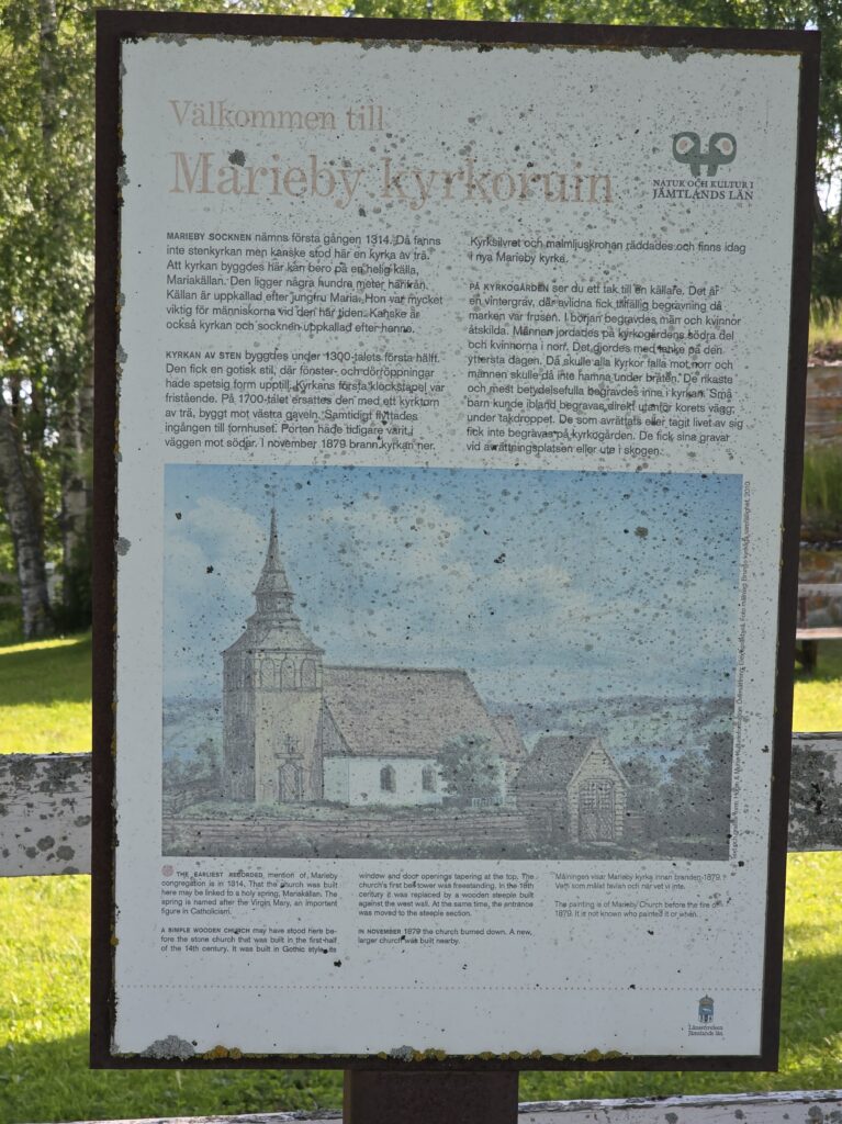 På sommeren arrangeres det utendørs gudstjeneste i kirkeruinen i Marieby. På kirkegården så vi taket på en liten kjeller. I tidligere tider oppbevarte man de døde i kjelleren fram til frosten slapp taket i jorda på vårparten. I gode gamle dager ble menn og kvinner gravlagt hver for seg. Mennene i den sørlige delen av kirkegården, kvinnene mot nord. De rike og mer betydningsfulle fikk sitt siste hvilested innendørs