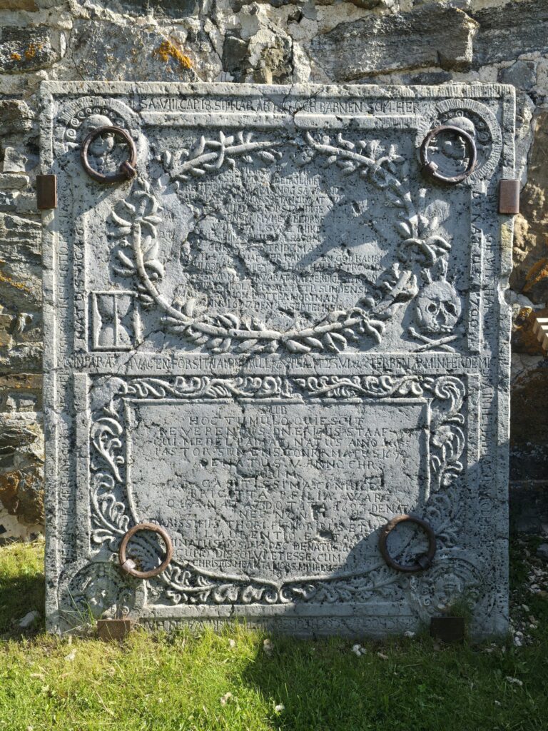 Denne gravhellen lå tidligere i midtgangen i Sunne kirke. Graven under hellen huset minst seks prester og flere av deres nære slektninger. Gravplaten ble bestilt av prestene Lundell og Staff i 1697. Den øvre delen av steinen er viet Lundell, den nedre forteller om livet til Staff