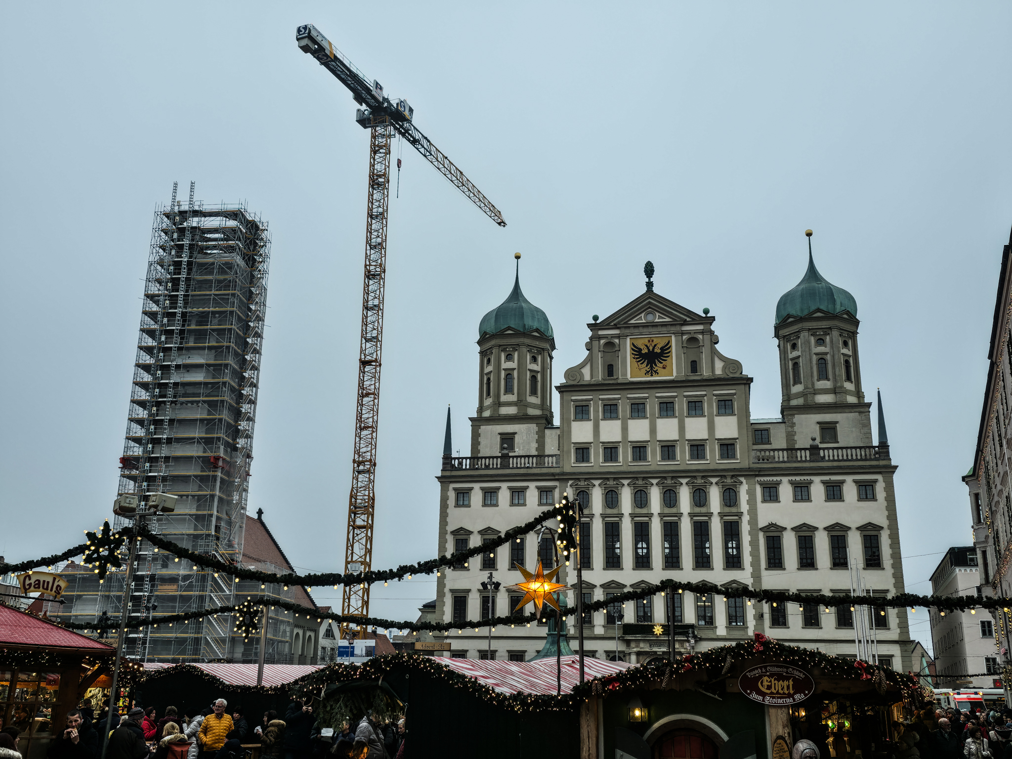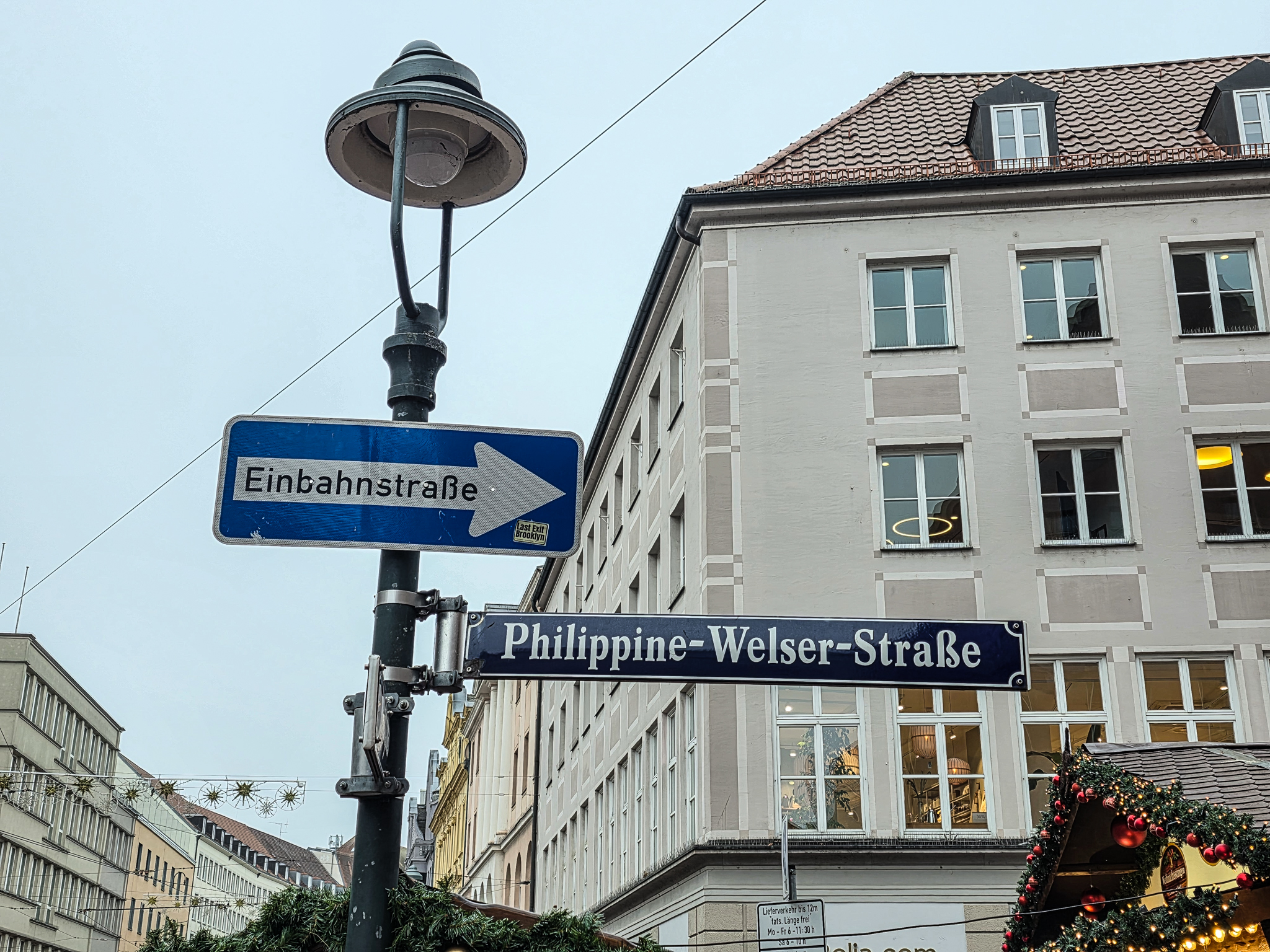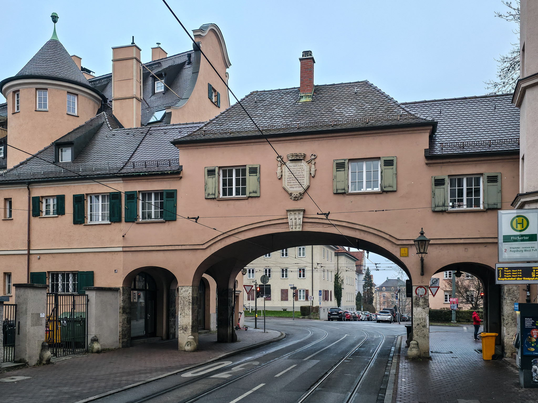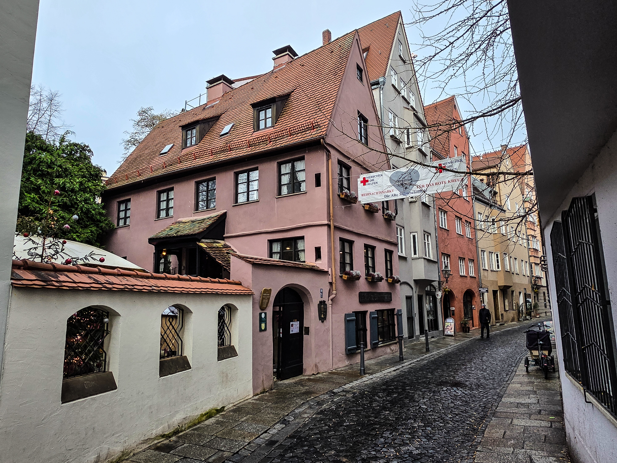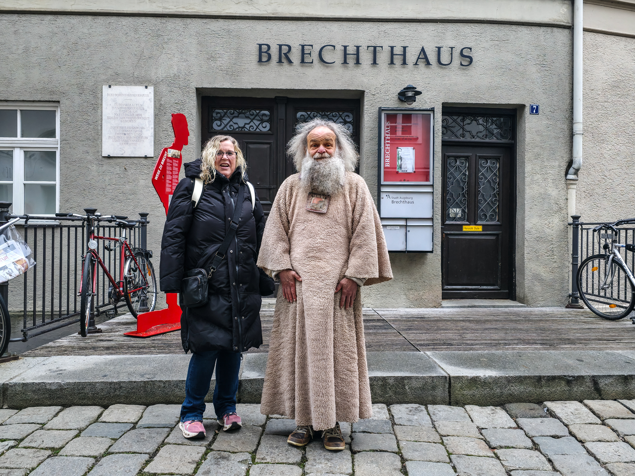 Augsburg er en by i det historiske landskapet SchwabenForfatteren, dramatikeren og poeten Eugen Bertolt Brecht (1898–1956) vokste opp i en middelklassefamilie i Augsburg. Utenfor Brecht-huset, stedet hvor Bertolt Brecht ble født 10.februar 1898, traff vi denne fargerike karen. Han omtalte seg selv som «kongen av Augsburg»Jakobertor er en del av den opprinnelige bymuren som omkranset Augsburg fra 1300-tallet. Jakobertor, oppkalt etter helgene Jakob, var en av flere porter i bymuren. Gjennom Jakobertor kontrollerte augsburgerne hvem som beveget seg inn og ut av bykjernenFargerike byggverk lyser opp i et grått og trist vinterlandskapAugsburg har fått navn etter Romerrikets første keiser. Gaius Octavius, også kjent som Octavian, tok senere navnet Augustus. Han ble født i Roma i år 63 BC og var adoptivsønnen til Julius Caesar. Augustus regnes som en av de mest betydningsfulle skikkelsene i antikkens historie. Han regjerte fra år 27 BC til år 14 AD. Statuen av Augustus står utstilit i Maximilian-museetEn rekke minner fra romertiden står utstilt nær domkirken i Augsburg. Konglene på øverste hylle kalles på tysk for pinienzapfen. Dette er kongler fra pinjetreet, middelhavstreet som gir oss pinjekjerner. I antikken symboliserte pinienzapfen «livet etter døden». Konglen har fungert som historisk symbol for Augsburg siden middelalderen. I dag ser man slike konglelignende symboler på en rekke steder i bybildetAugsburg har, som mange andre gamle byer, flere helgener. Sankt Ulrich er en av dem. Ulrich ble født i Kyborg i Sveits i 890 og døde i Augsburg i 973. Ulrich regnes som den første personen som ble kanonisert av en pave, noe som skal ha skjedd i 993. I 924 ble han utnevnt til biskop av Augsburg av den tysk-romerske keiseren Henrik Fuglefangeren. Ulrichs sarkofag er plassert i en av de store kirkene i AugsburgInnsamling av penger til sykehusklovneneElias Holl (1573-1646) regnes som den fremste renessansearkitekten i Tyskland. Han var født og levde det meste av livet i hjembyen Augsburg. Her ser vi hovedverket hans, rådhuset som ble reist mellom 1614-20. Nesten 200 mann sto for det praktiske arbeidet. De to tårnene ble innlemmet i byggverket i 1618. Innvendig har rådhuset en 550 kvadratmeter stor sal med vegger og tak dekket av bladgull. Rådhussalen er Augsburgs største turistattraksjonBåde rådhussalen og Perlach-tårnet var under renovering og derfor stengt da vi besøkte Augsburg. Det har stått vakttårn ved rådhuset siden 989. Dagens steintårn ble påbegynt i 1412 og betydelig påbygget av Elias Holl i 1614–16. Det 70 meter høye tårnet ble hardt skadet under andre verdenskrig og senere gjenoppbygget. Perlach-tårnet har vært stengt siden 2017 og skal etter planen åpne i ny drakt i 2027. Under reparasjonsarbeidet er kuppelen midlertidig plassert på bakkenDet årlige julemarkedet i Augsburg legges selvsagt til rådhusplassen. Her ser vi bankbygget Stadtsparkasse, med byens egen julekalender godt synlig i vindueneSt. Nikolaus, er en bispelignende religiøs skikkelse med røtter tilbake til middelalderen som besøker julemarkeder, skoler og hjem i førjulstiden i Sør-Tyskland. Nikolaus framstår som en klok og vennlig biskop med mitra, bispestav og kappe. Han er opptatt av omsorg, nestekjærlighet og omtanke. Der hvor Nikolaus bringer ro og vennlighet, følger også hans mørkere motstykke, Krampus. Sistnevntes oppgave er å minne de uskikkelige om å skjerpe segForfedrene til den berømte komponisten Wolfgang Amadeus Mozart kom opprinnelig fra Augsburg. Faren Leopold, også han en kjent musiker og komponist ble født i dette huset i Frauentorstraße i 1719. Han flyttet til Salzburg i 1737 for å studere musikkDen nord-østlige delen av den såkalte svenskemuren, er en godt bevart del av Augsburgs gamle bybefestning. Muren har fått navnet etter de svenske beleiringene av Augsburg i 1632, under trettiårskrigen. I dag er den et synlig minne om en dramatisk periode i byens historieI en nisje i svenskemuren fant vi steinfiguren, Stoinerna Ma. Figuren har opphav i et sagn som knytter seg til bakeren Konrad Hacker. Under beleiringen av Augsburg på 1630-tallet skal han med risiko for eget liv ha gått opp på bymuren og vist fram det siste brødet han hadde slik at de beleirende troppene ble overbevist om at Augsburg fortsatt hadde rikelig med mat. På det viset lurte Konrad de beleirende troppene og reddet dermed byenSt. Gallus-kapellet er sannsynligvis det eldste bevarte kirkebygget i Augsburg. Her oppe på Gallus-høyden hadde romerne tidlig anlagt en helligdom til ære for guden Merkur. Dagens kirke ble innviet da pave Leo 9 passerte gjennom Augsburg i 1051Augsburger Puppenkiste (Oehmichens Marionettentheater) er et tysk marionetteater som oppsto i enkel form under krigen og ble offisielt gjenetablert i 1948. Teateret holder til i Heilig‑Geist Spital, det gamle klosterhospitalet. Dukketeateret i Spitalgasse i Augsburg regnes i dag som et av Tysklands mest anerkjente og berømte teatreI ukene før jul viste Puppenkiste «Die Weihnachtsgeschichte», historien om Josef, Maria og barnet. Vi hadde sikret oss billetter til forestillingen før avreise. Figurene på dette bildet er fra en tidligere forestilling i marionetteteateretBobs bar ga oss et velfortjent pusterom mellom alle attraksjoneneFC Augsburg, grunnlagt i 1907, har siden 2011 vært et fast innslag i Bundesliga. Denne plakaten fant vi i en av byens sportsbutikker. Den helga vi besøkte Augsburg beseiret de Bayern Leverkusen på hjemmestadioen WWK ArenaRådhusplassen i miniatyr. På bildet ser vi rådhuset, Perlach-tårnet og resten av bebyggelsen som omkranser byens mest sentrale punktFlere tyske julemarkeder har de siste årene vært utsatt for terrorangrep med kjøretøy. I Augsburg hadde man derfor satt opp tunge, men flyttbare pullerter for anledningen. Barrierene ble midlertidig fjernet hver gang en av byens mange trikker skulle passere over torgplassenVeverhuset i Augsburg var laugshus for 