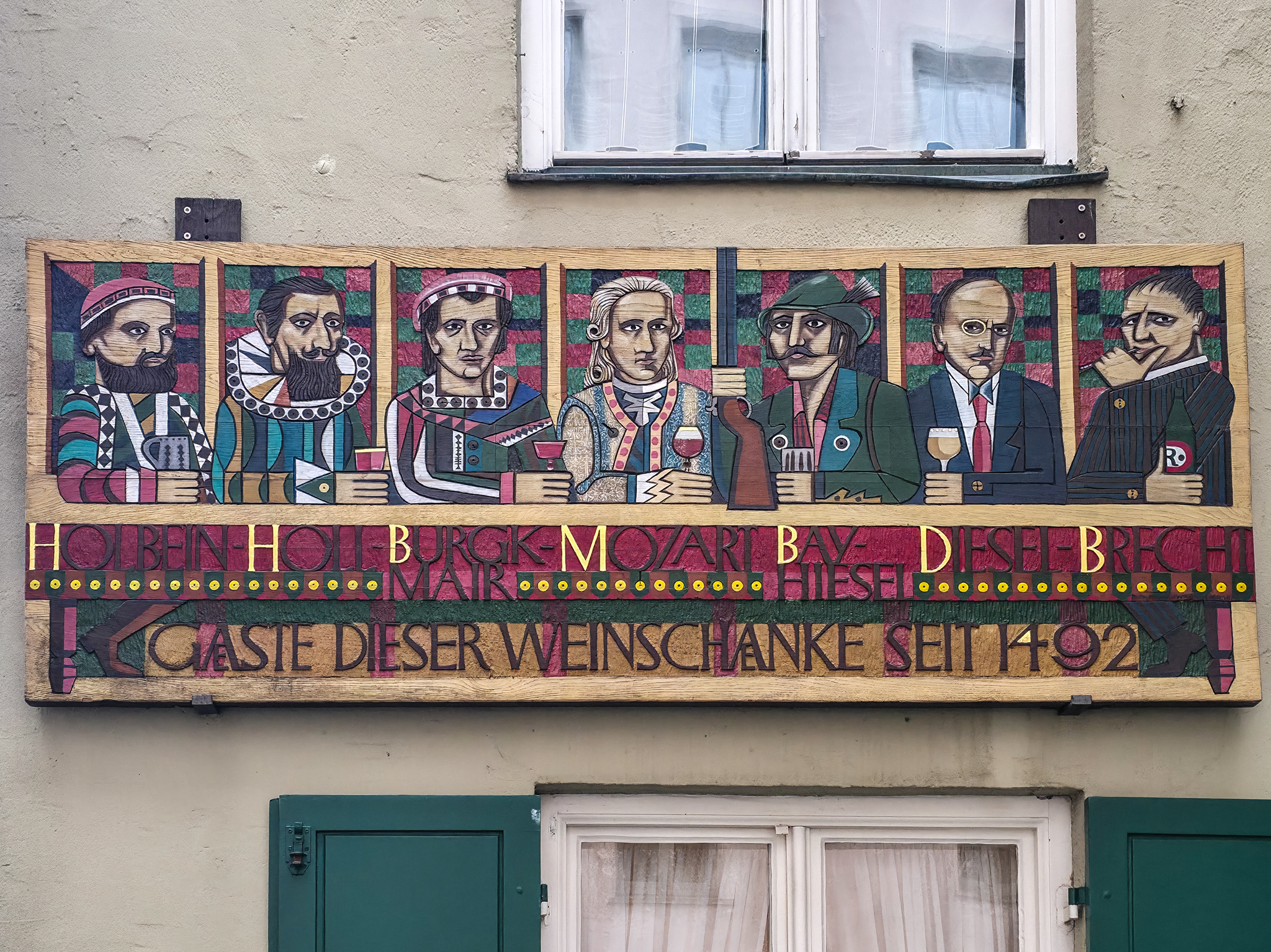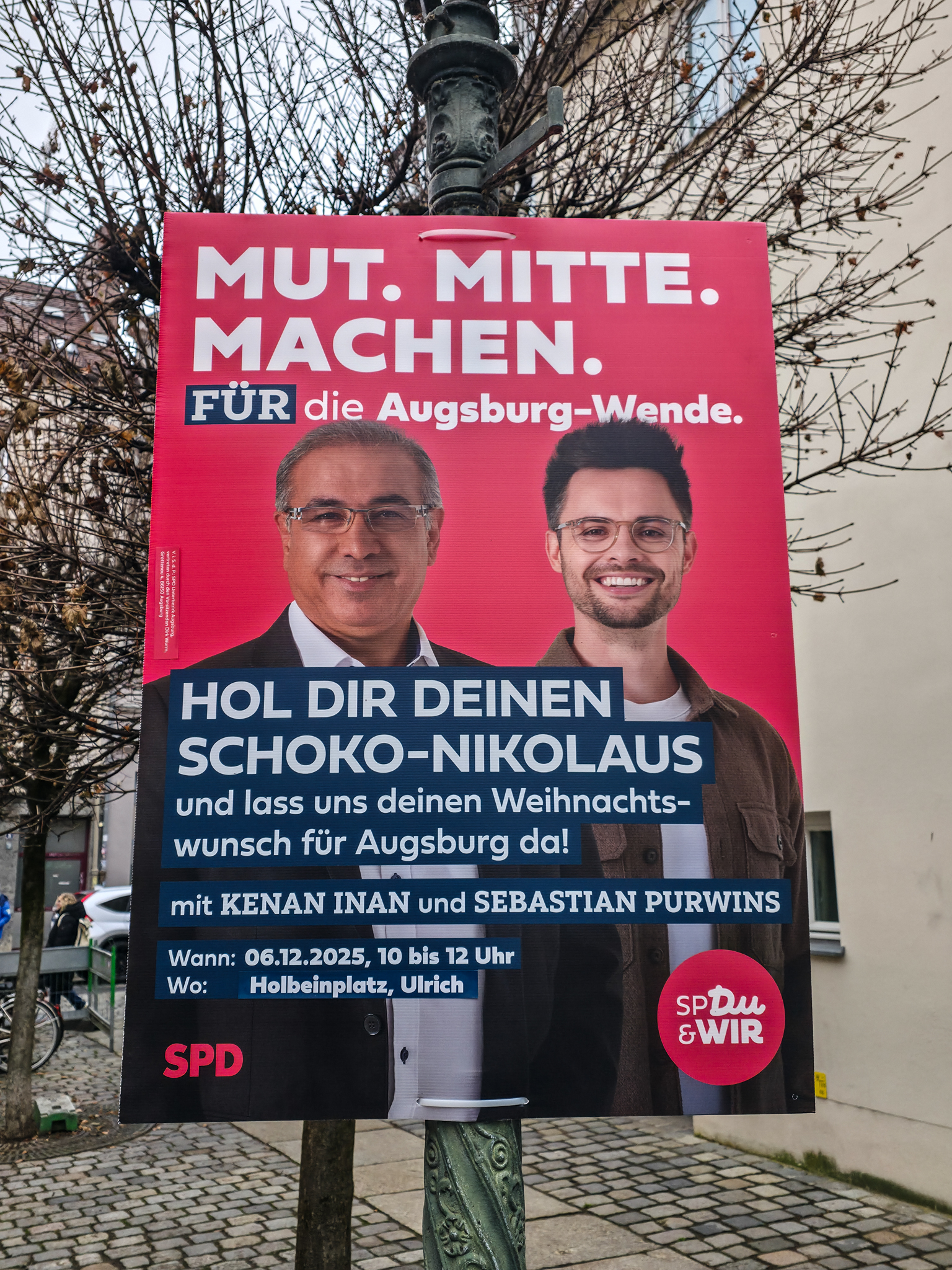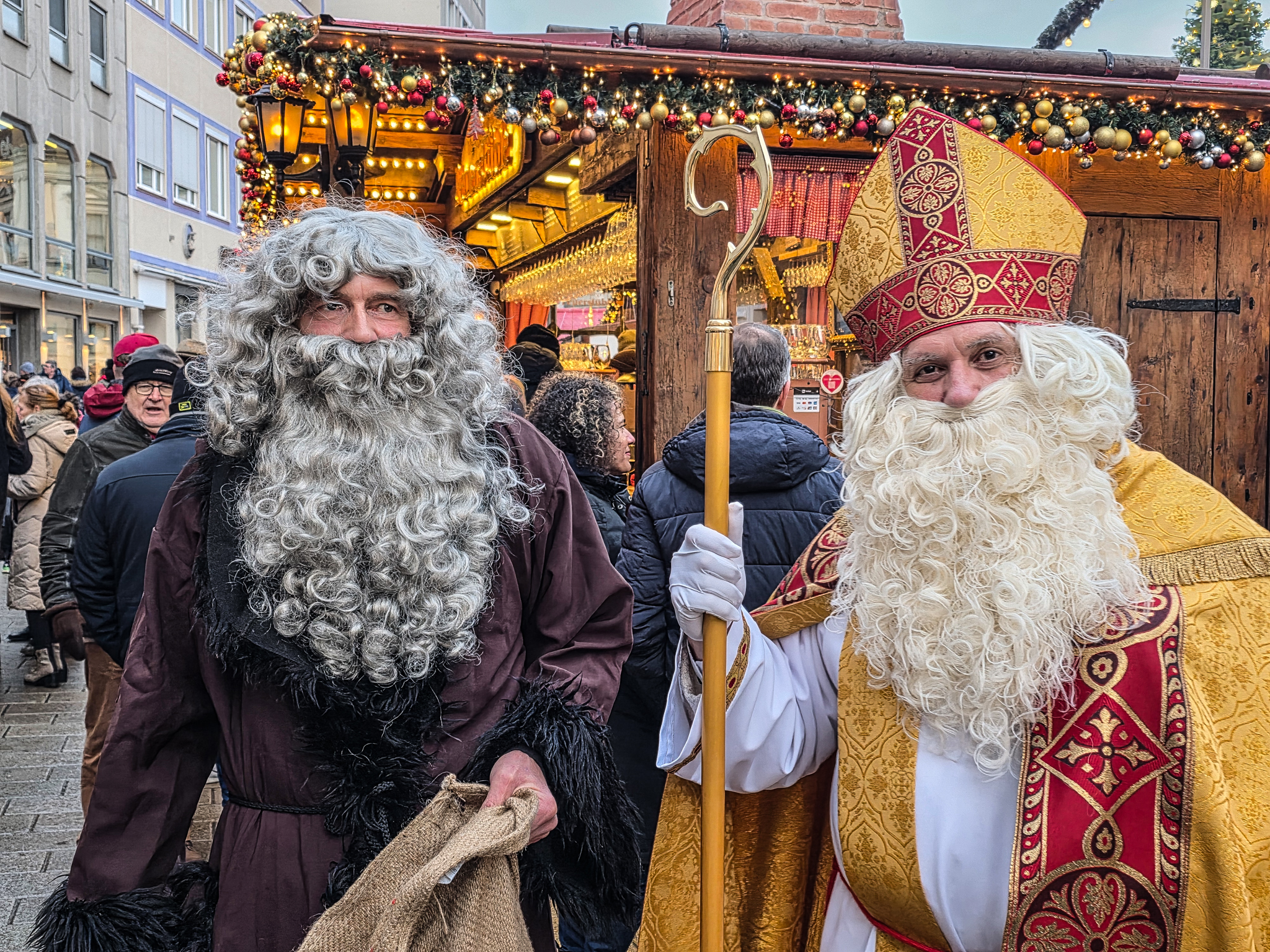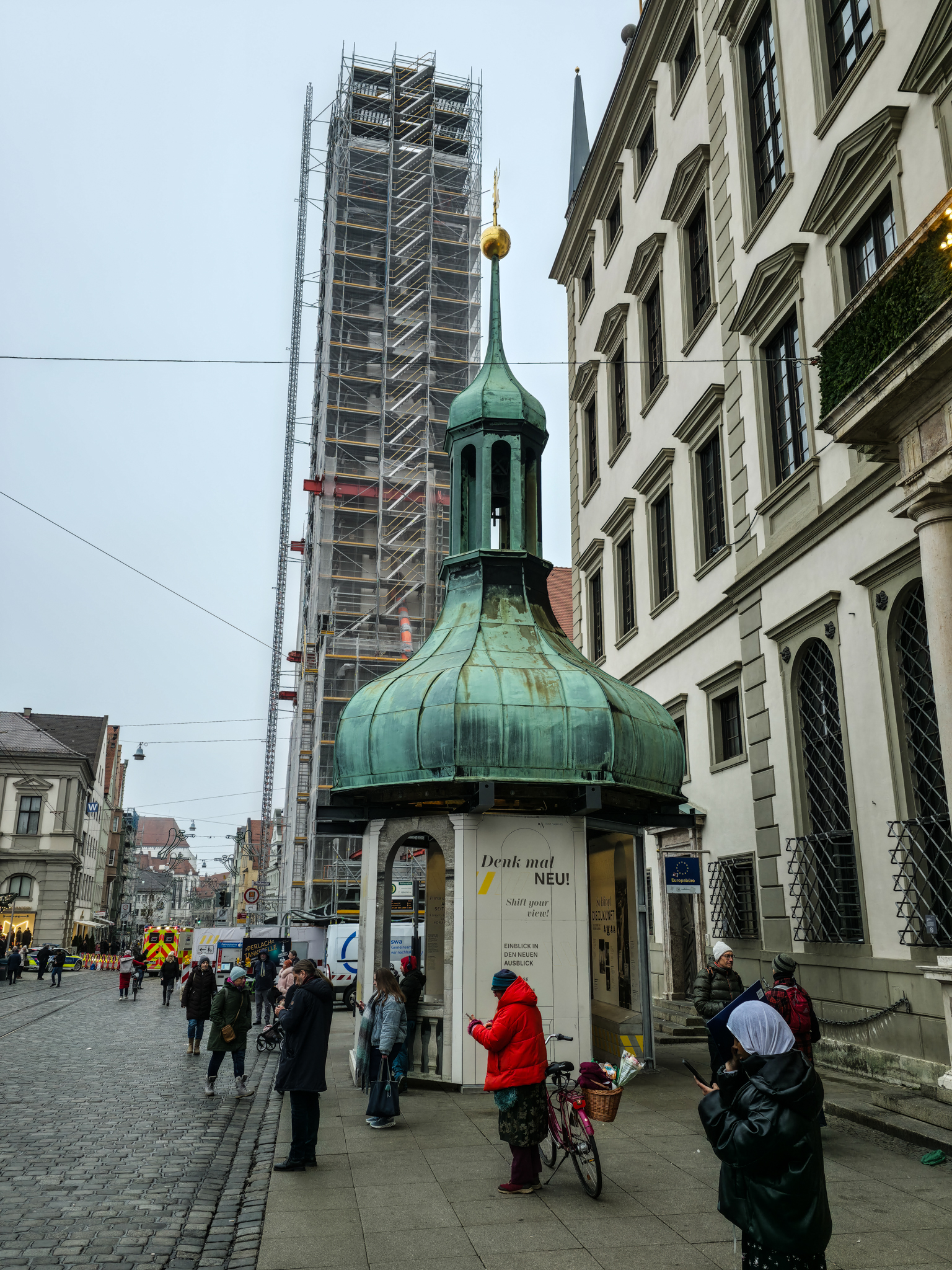 Augsburg er en by i det historiske landskapet SchwabenForfatteren, dramatikeren og poeten Eugen Bertolt Brecht (1898–1956) vokste opp i en middelklassefamilie i Augsburg. Utenfor Brecht-huset, stedet hvor Bertolt Brecht ble født 10.februar 1898, traff vi denne fargerike karen. Han omtalte seg selv som «kongen av Augsburg»Jakobertor er en del av den opprinnelige bymuren som omkranset Augsburg fra 1300-tallet. Jakobertor, oppkalt etter helgene Jakob, var en av flere porter i bymuren. Gjennom Jakobertor kontrollerte augsburgerne hvem som beveget seg inn og ut av bykjernenFargerike byggverk lyser opp i et grått og trist vinterlandskapAugsburg har fått navn etter Romerrikets første keiser. Gaius Octavius, også kjent som Octavian, tok senere navnet Augustus. Han ble født i Roma i år 63 BC og var adoptivsønnen til Julius Caesar. Augustus regnes som en av de mest betydningsfulle skikkelsene i antikkens historie. Han regjerte fra år 27 BC til år 14 AD. Statuen av Augustus står utstilit i Maximilian-museetEn rekke minner fra romertiden står utstilt nær domkirken i Augsburg. Konglene på øverste hylle kalles på tysk for pinienzapfen. Dette er kongler fra pinjetreet, middelhavstreet som gir oss pinjekjerner. I antikken symboliserte pinienzapfen «livet etter døden». Konglen har fungert som historisk symbol for Augsburg siden middelalderen. I dag ser man slike konglelignende symboler på en rekke steder i bybildetAugsburg har, som mange andre gamle byer, flere helgener. Sankt Ulrich er en av dem. Ulrich ble født i Kyborg i Sveits i 890 og døde i Augsburg i 973. Ulrich regnes som den første personen som ble kanonisert av en pave, noe som skal ha skjedd i 993. I 924 ble han utnevnt til biskop av Augsburg av den tysk-romerske keiseren Henrik Fuglefangeren. Ulrichs sarkofag er plassert i en av de store kirkene i AugsburgInnsamling av penger til sykehusklovneneElias Holl (1573-1646) regnes som den fremste renessansearkitekten i Tyskland. Han var født og levde det meste av livet i hjembyen Augsburg. Her ser vi hovedverket hans, rådhuset som ble reist mellom 1614-20. Nesten 200 mann sto for det praktiske arbeidet. De to tårnene ble innlemmet i byggverket i 1618. Innvendig har rådhuset en 550 kvadratmeter stor sal med vegger og tak dekket av bladgull. Rådhussalen er Augsburgs største turistattraksjonBåde rådhussalen og Perlach-tårnet var under renovering og derfor stengt da vi besøkte Augsburg. Det har stått vakttårn ved rådhuset siden 989. Dagens steintårn ble påbegynt i 1412 og betydelig påbygget av Elias Holl i 1614–16. Det 70 meter høye tårnet ble hardt skadet under andre verdenskrig og senere gjenoppbygget. Perlach-tårnet har vært stengt siden 2017 og skal etter planen åpne i ny drakt i 2027. Under reparasjonsarbeidet er kuppelen midlertidig plassert på bakkenDet årlige julemarkedet i Augsburg legges selvsagt til rådhusplassen. Her ser vi bankbygget Stadtsparkasse, med byens egen julekalender godt synlig i vindueneSt. Nikolaus, er en bispelignende religiøs skikkelse med røtter tilbake til middelalderen som besøker julemarkeder, skoler og hjem i førjulstiden i Sør-Tyskland. Nikolaus framstår som en klok og vennlig biskop med mitra, bispestav og kappe. Han er opptatt av omsorg, nestekjærlighet og omtanke. Der hvor Nikolaus bringer ro og vennlighet, følger også hans mørkere motstykke, Krampus. Sistnevntes oppgave er å minne de uskikkelige om å skjerpe segForfedrene til den berømte komponisten Wolfgang Amadeus Mozart kom opprinnelig fra Augsburg. Faren Leopold, også han en kjent musiker og komponist ble født i dette huset i Frauentorstraße i 1719. Han flyttet til Salzburg i 1737 for å studere musikkDen nord-østlige delen av den såkalte svenskemuren, er en godt bevart del av Augsburgs gamle bybefestning. Muren har fått navnet etter de svenske beleiringene av Augsburg i 1632, under trettiårskrigen. I dag er den et synlig minne om en dramatisk periode i byens historieI en nisje i svenskemuren fant vi steinfiguren, Stoinerna Ma. Figuren har opphav i et sagn som knytter seg til bakeren Konrad Hacker. Under beleiringen av Augsburg på 1630-tallet skal han med risiko for eget liv ha gått opp på bymuren og vist fram det siste brødet han hadde slik at de beleirende troppene ble overbevist om at Augsburg fortsatt hadde rikelig med mat. På det viset lurte Konrad de beleirende troppene og reddet dermed byenSt. Gallus-kapellet er sannsynligvis det eldste bevarte kirkebygget i Augsburg. Her oppe på Gallus-høyden hadde romerne tidlig anlagt en helligdom til ære for guden Merkur. Dagens kirke ble innviet da pave Leo 9 passerte gjennom Augsburg i 1051Augsburger Puppenkiste (Oehmichens Marionettentheater) er et tysk marionetteater som oppsto i enkel form under krigen og ble offisielt gjenetablert i 1948. Teateret holder til i Heilig‑Geist Spital, det gamle klosterhospitalet. Dukketeateret i Spitalgasse i Augsburg regnes i dag som et av Tysklands mest anerkjente og berømte teatreI ukene før jul viste Puppenkiste «Die Weihnachtsgeschichte», historien om Josef, Maria og barnet. Vi hadde sikret oss billetter til forestillingen før avreise. Figurene på dette bildet er fra en tidligere forestilling i marionetteteateretBobs bar ga oss et velfortjent pusterom mellom alle attraksjoneneFC Augsburg, grunnlagt i 1907, har siden 2011 vært et fast innslag i Bundesliga. Denne plakaten fant vi i en av byens sportsbutikker. Den helga vi besøkte Augsburg beseiret de Bayern Leverkusen på hjemmestadioen WWK ArenaRådhusplassen i miniatyr. På bildet ser vi rådhuset, Perlach-tårnet og resten av bebyggelsen som omkranser byens mest sentrale punktFlere tyske julemarkeder har de siste årene vært utsatt for terrorangrep med kjøretøy. I Augsburg hadde man derfor satt opp tunge, men flyttbare pullerter for anledningen. Barrierene ble midlertidig fjernet hver gang en av byens mange trikker skulle passere over torgplassenVeverhuset i Augsburg var laugshus for 