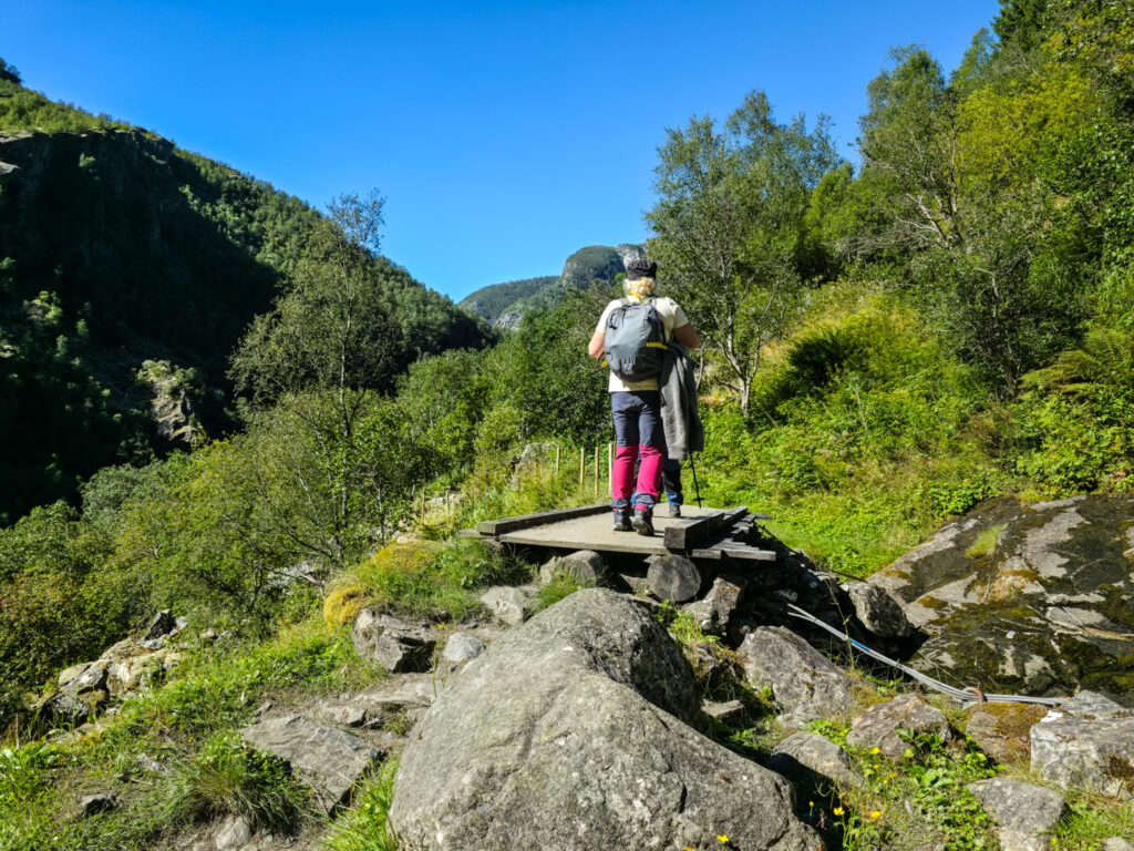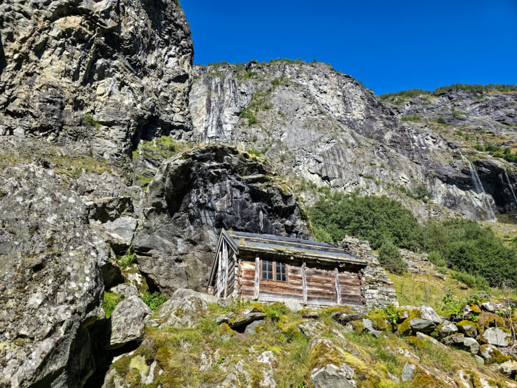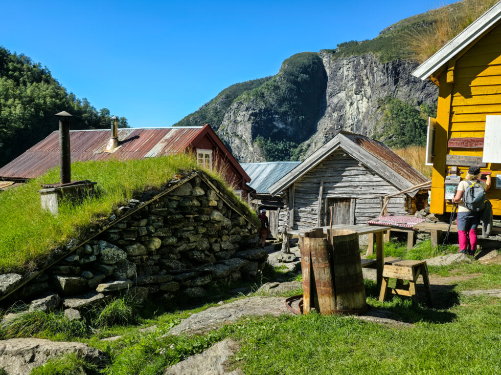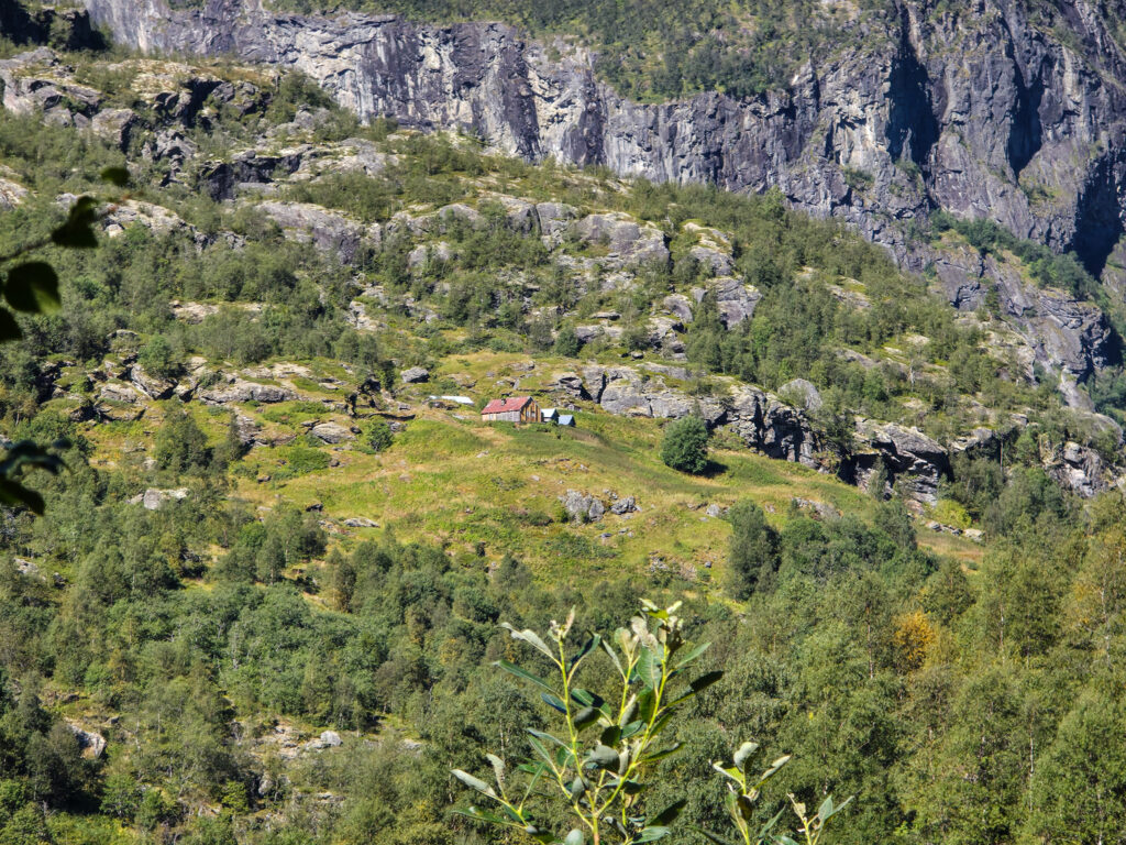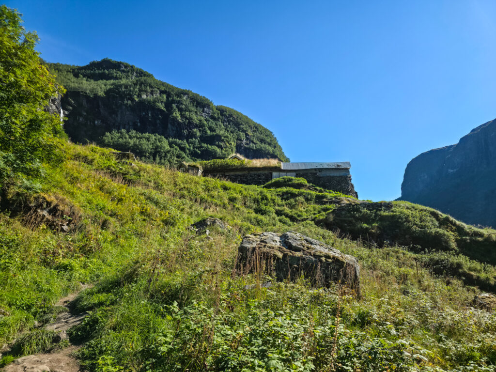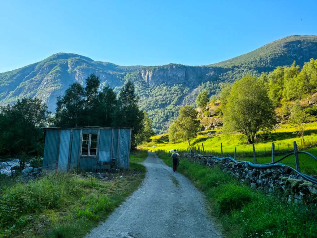 Vi har kjørt de tre milene fra Aurland til Østerbø. Fjellstuene her fungerer ofte som utgangspunkt for den siste etappen av vandreruta ned til Vassbygdi. Denne strekningen er 19 kilometer lang, og turen tar mellom 6 og 9 timer å gå. Du starter på 820 meter over havet og ender på 70 meter nede i Vassbygdi. Med andre ord, en formidabel nedstigning.
