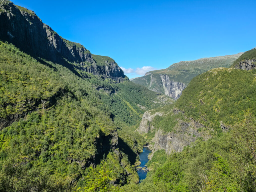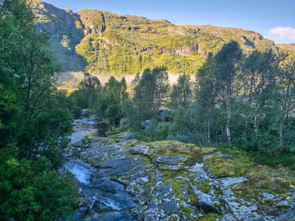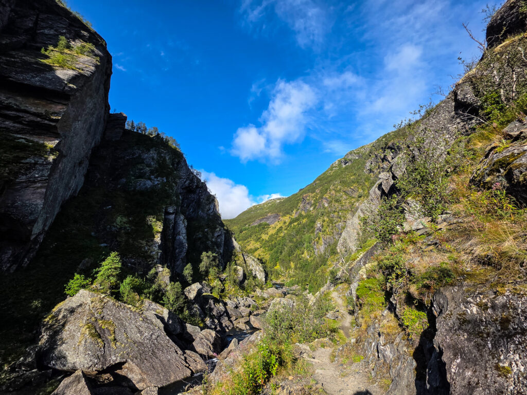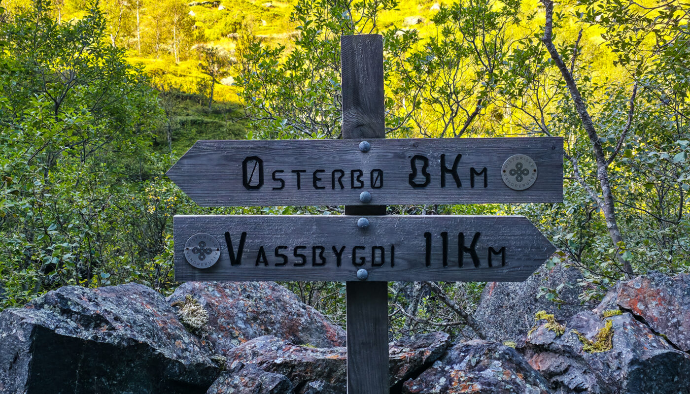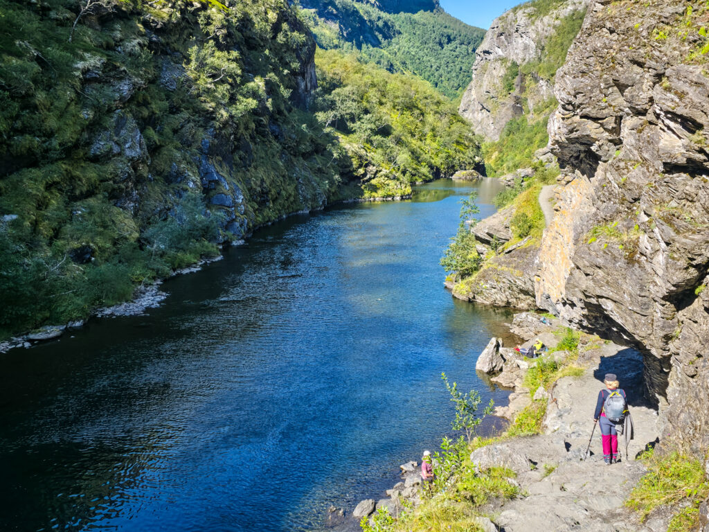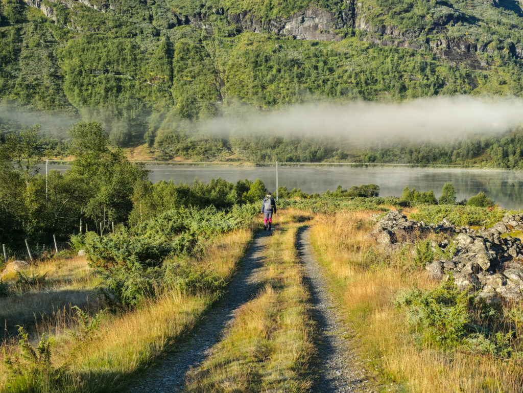 Vi har kjørt de tre milene fra Aurland til Østerbø. Fjellstuene her fungerer ofte som utgangspunkt for den siste etappen av vandreruta ned til Vassbygdi. Denne strekningen er 19 kilometer lang, og turen tar mellom 6 og 9 timer å gå. Du starter på 820 meter over havet og ender på 70 meter nede i Vassbygdi. Med andre ord, en formidabel nedstigning.