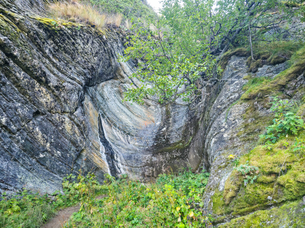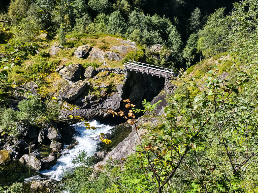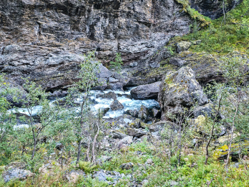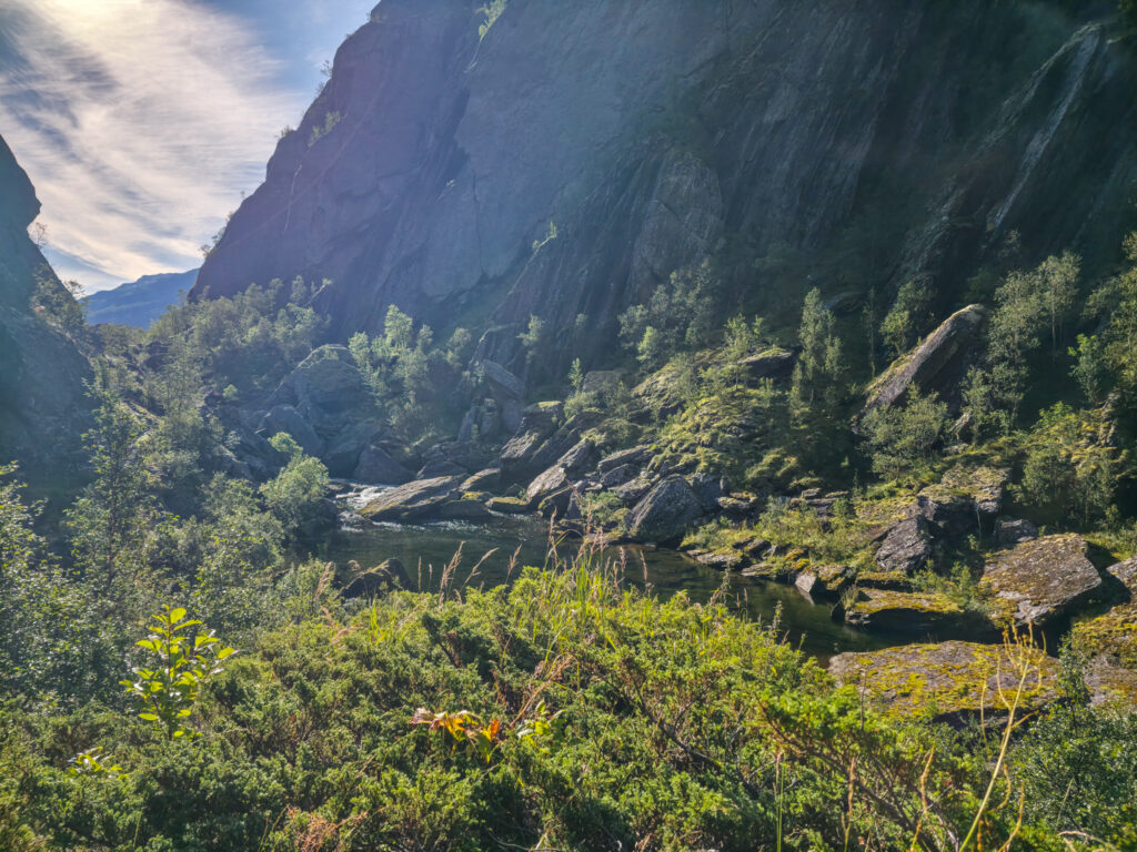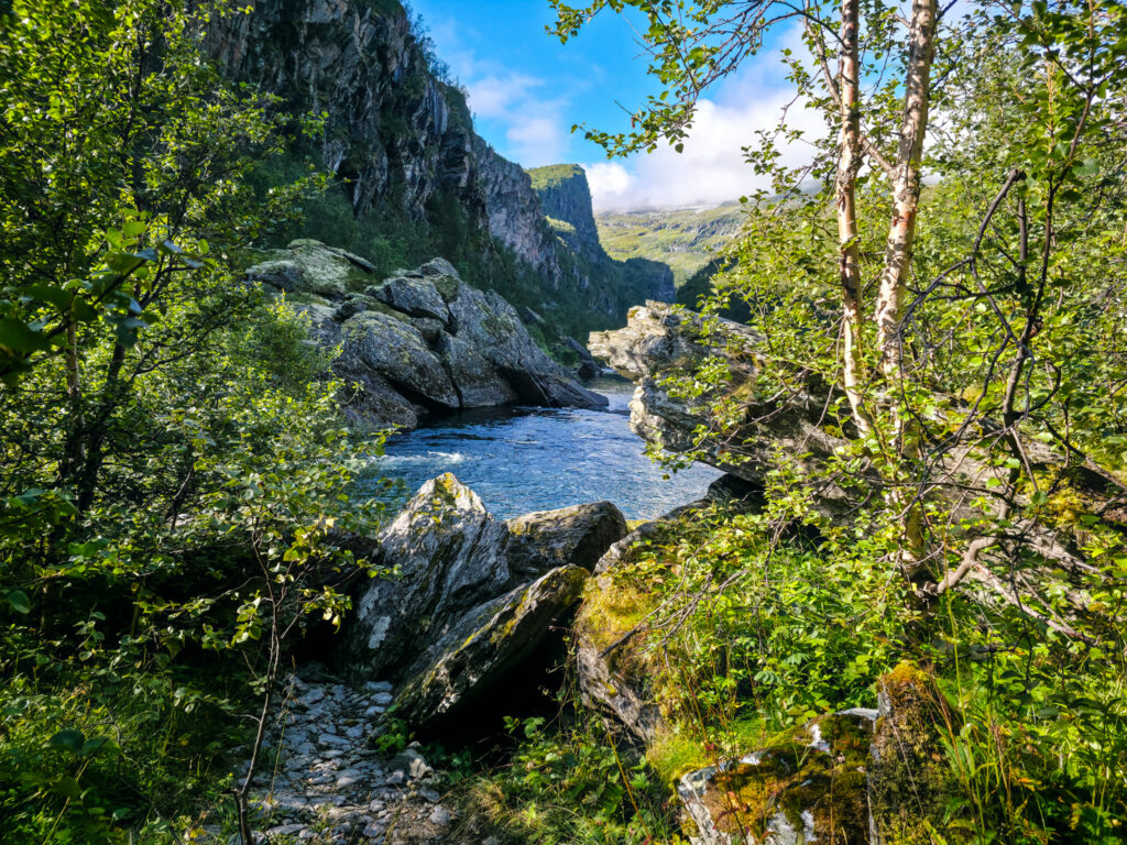 Et lite stykke etter Nesbøvannet, ved Tirtesva, deler stien seg. Den øvre, luftigste og mest utfordrende turløypa bærer navnet Bjønnstigen. Vi valgte den noe lengere ruta langs elva. De to rutene møtes et litt før Vetlehelvete
