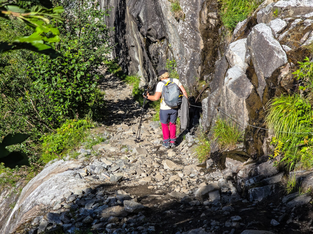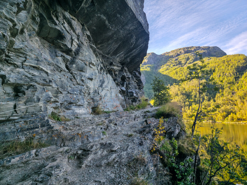 Nytt bratt parti. Snora i fjellveggen tar oss trygt forbi Holmaberget