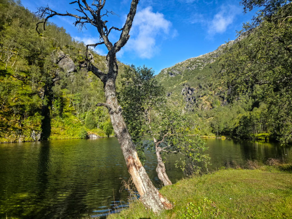 Vi tok dagens første pause på et idyllisk sted ved Aurlandselvi