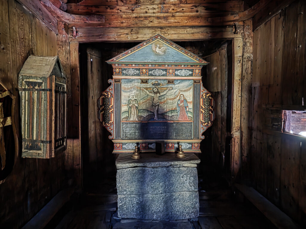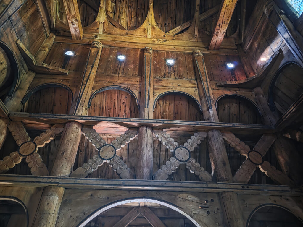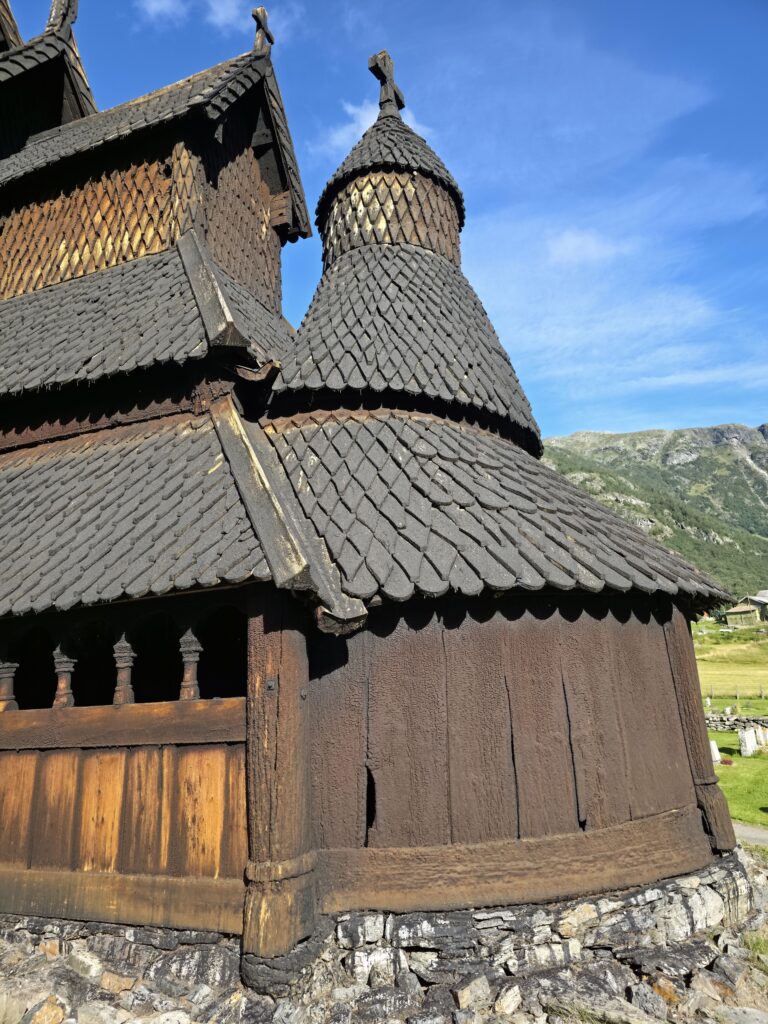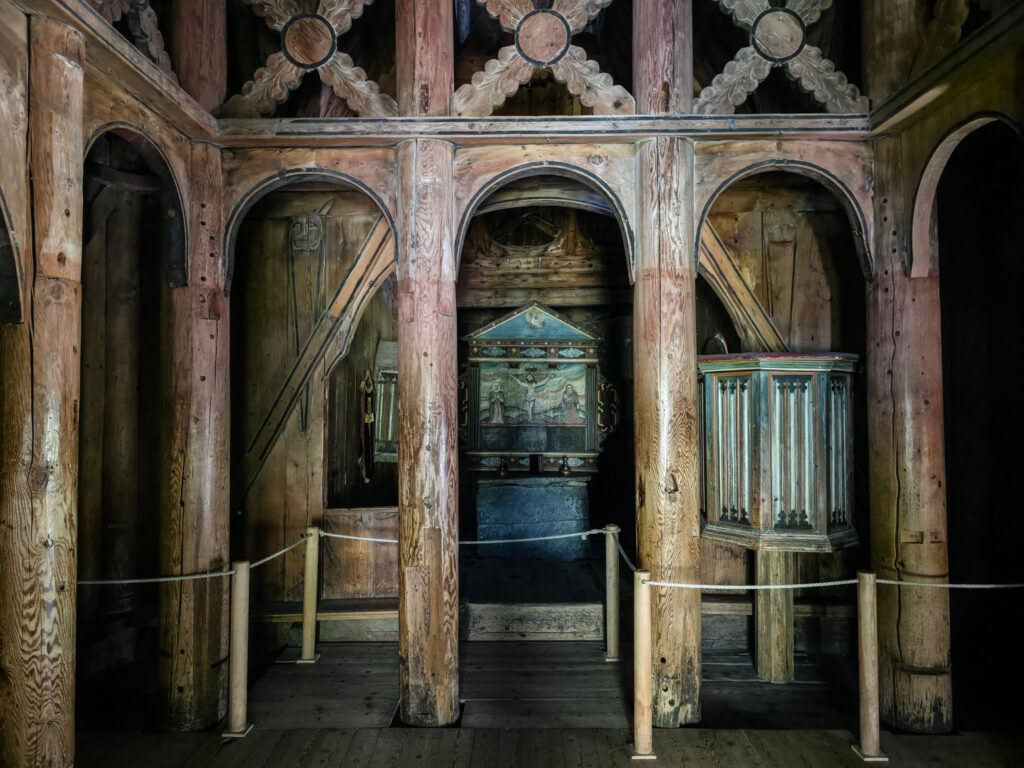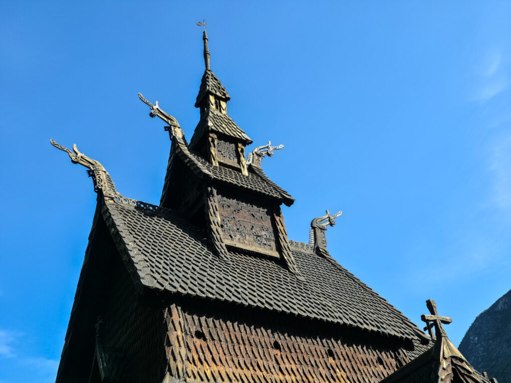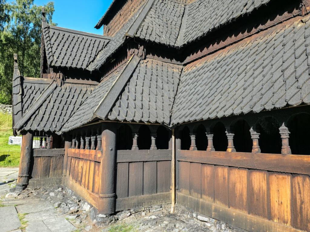Årringdateringer har avdekket at furutømmeret som ble brukt i kirka ble felt vinteren 1180-1181. Man regner derfor med at kirken var oppført og klar til bruk i god tid før år 1200. I bakgrunnen ser vi besøkssenteret som sto ferdig i 2005. Legg merke til de små lysgluggene oppe på veggenTaket er gjerne det mest imponerende. Seks taknivå med til sammen 18 000 takspon. Helt på toppen ser vi takrytteren. Dragehodene er plassert på skipets møne og på det nederste nivået tilhørende takrytteren. Dragehodene var ment til å «skremme bort» onde ånder, mens korsene uttrykte tro og håpKirken var i utgangspunktet en del enklere enn idag. Den besto av kor og skip, og var uten svalgang, takrytter og apsis. Fram til reformasjonen hadde kirken bare ståplasser. En innvendig skillevegg, ett korskille delte kirkerommet i to, og skilte fra prest fra menighet. En eller annen gang etter 1536 fjernet man korskillet og monterte trebenker inne i lokaletBorgund stavkirke var katolsk fra byggeåret til 1536. Kirken var viet til apostelen Andreas. Dette bildet synliggjør den innvendige konstruksjonen med staver, sperr og bjelker. De øvre delene av stavene er dekorert. De skråstilte utskårne kryssene med sirkulært sentrum bærer navnet «Andreaskors». Øverst i bildet ser vi deler av taket og de små gluggene som slipper inn dagslysOm lag 50 000 turister besøker kirken hvert eneste år. Restaureringsarbeidet som var ferdig i 1872 hadde som målsetning å tilbakeføre kirkebygget til katolsk tid. Kirkegården er fortsatt i aktiv brukBildet fra 1907 viser mennesker fra Borgund på vei til gudstjeneste i kirka. Borgund kirke hadde sentral plassering på ferdselsveien fra vest til øst i NorgeSakramentskap kom på plass i kirken en gang mellom 1550-1570. Rammen rundt altertavlen er fra år 1620, mens selve tavlen er datert til 1654. Den korsfestede Jesus er flankert av jomfru Maria og Johannes Døperen. Alterring bygd mellom 1717-1719. Vinduet til høyre er av nyere datoDyreornamentikk fra middelalderen. Snorre Sturlasson var av den oppfatning at kristendommen nådde Sogn få år før årtusenskiftet. Mange mennesker valgte likevel å holde på de norrøne gudene og den hedensk tradisjon til langt inn i katolsk tid. Stavkirkene har derfor ofte avbildninger og utskjæringer med førkristen bakgrunn. Dette bidro til å lette overgangen til «den nye troen»Den runde delen av kirka kalles for en apsis. Takrytteren og apsisen stammer trolig fra 1300-tallet. Borgund er en av få stavkirker som har fått stå så og si har stått uendret siden middelalderen. Det finnes kopier av Borgund stavkirke i Paris, i Hahnenklee i Tyskland og i Rapid City, Washington Island og Lyme i USAKlimaet i Borgund er veldig tørt. Det har nok bidratt til konservering av kirkebygget. Alle overflater er i tillegg tjærebredd. Varm tretjære fra furu ble påført alle de utvendige flatene. Tjæra trengte inn i treverket og skapte et beskyttende og vannavstøtende lag mot fukt, sopp og insekter. Finknust trekull ble blandet inn for å stabilisere tjæraPrekestolen ble satt inn mellom 1550-1570. Kirkerommet er lite og forholdsvis trangt. Da den nye kirkeloven trådte i kraft i 1851 stilte den krav om at minst 1/3 av soknebarna skulle ha sitteplass under gudstjenesten. Borgund stavkirke ble dermed for liten, og tatt ut av bruk i 1868. Oppe til høyre og venstre for alteret kan vi skimte utskårne dyremaskerDen røde kirken, Borgund nye kirke, sto ferdig i 1868. Til høyre ser vi en støpul, et frittstående klokketårn fra 1200-tallet. Støpulen ved Borgund stavkirke er det eneste gjenværende og frittstående klokketårnet som er basert på stavverk her i landetDeler av svalgang og den kjegleformede apsisen. Det var kun det beste tømmeret som ble brukt i slike byggverk. Spesialiserte kirkebyggere gjorde grove stokker av malmfuru om til bygningsdeler med kun få og svært enkle redskaper. Dørbeslag, lås og hengsler var laget av smijern, ellers var resten av bygget laget av tre. Når kirka sto ferdig dro kirkebyggerne videre til neste sted. På det viset ble stavkirkebyggingen del av en århundrelang tradisjonKirka har tre portaler, alle med større eller mindre grad av utsmykningFuret, værbitt og preget av tidens tann. Borgund stavkirke er et utrolig flott kirkebygg og en betydelig kulturinstitusjon som det er viktig at vi klarer å verne for ettertidenPå rekke og rad ligger de, på nedsiden av fjellet Klanten. Borgund kirke, støpulen og Borgund stavkirke. I forkant skimtes en merkestein fra nyere tid. Den markerer veitraseene som har gått nær stavkirka siden kong Sverre`s tid