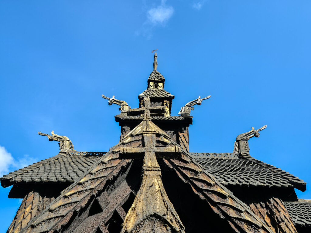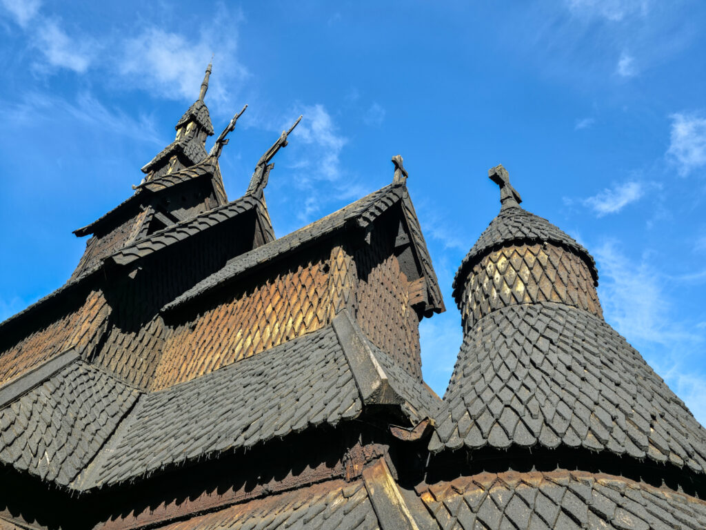Taket med seks høydenivåer er tekket med hele 18 000 takspon. Et lite tårn, en takrytter, markerer overgangen mellom kor og skip. Takrytteren har både praktisk, arkitektonisk og symbolsk betydning. I middelalderen rommet den periodevis kirkeklokker. På taket finnes flere kors, fire dragehoder og et spir med værhane.