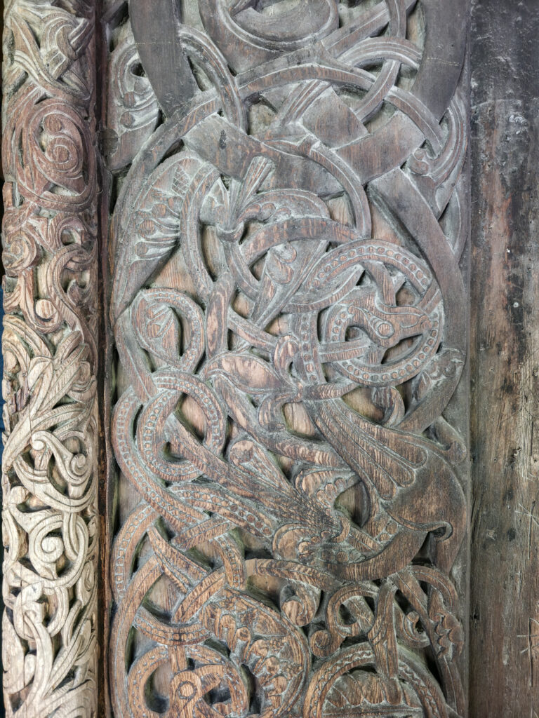 Flere av portalene har søyler som er utsmykket med dyreornamentikk. I middelalderen fungerte drager gjerne som symbol på djevelen. På vestportalen til kirken finner vi imponerende utskjæringer av drager som biter i hverandre, og som spyr ut kraftige rankestengler. Stenglene slynger seg oppover søylene. Tidlig i middelalderen fungerte hedenske motiver som uttrykk for kampen mellom det gode og det onde.