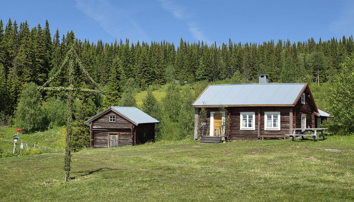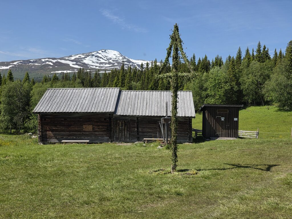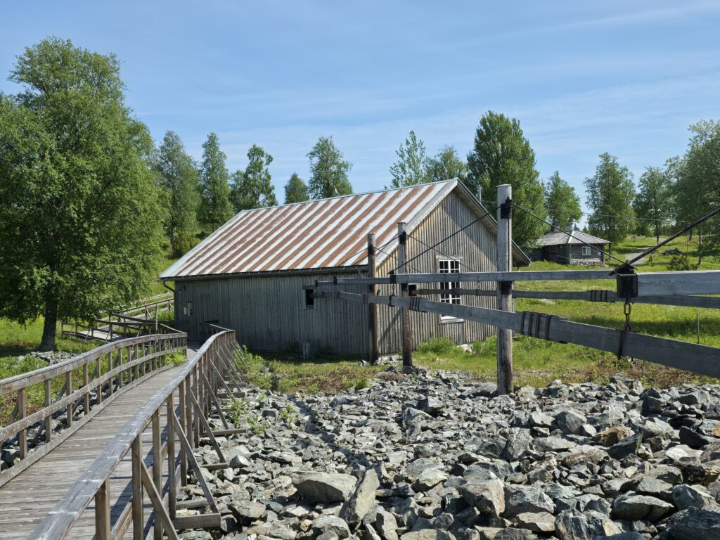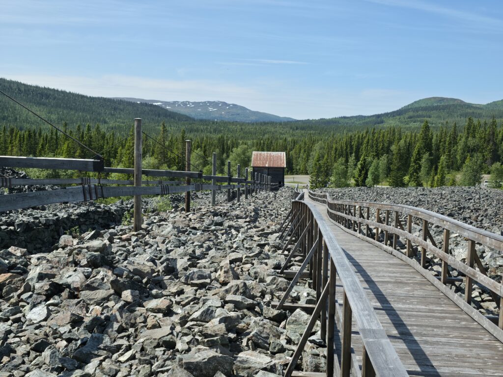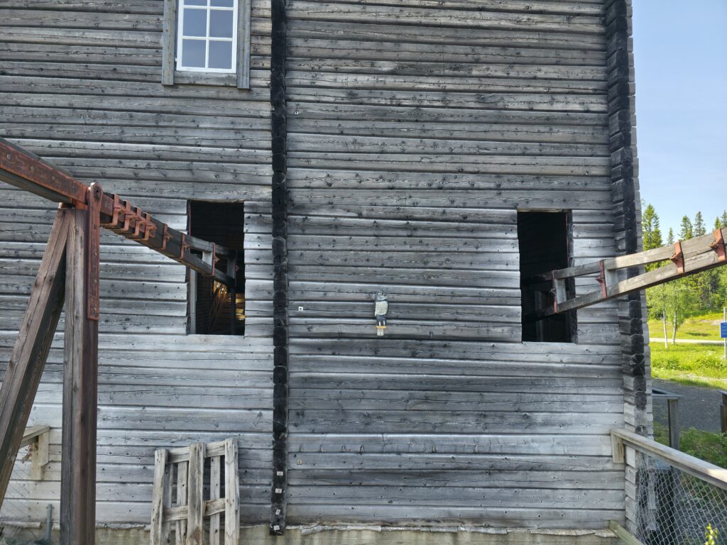 Vi svingte av fra E 14 ved Björnänge. Åre-Bjørnen heter dette skianlegget. Det lå langs veien inn til Fruå gruve. Fjellet i bakgrunnen heter Åreskutan. Toppen rager 1420 meter over havet. Det går gondolbane nesten helt til topps. Sveriges høyest beliggende kafé, Toppstugan befinner seg på toppen av ÅreskutanDen lange rørformede vannkanalen av tre kalles for en tretub. Den ledet vannet fra elva Fröån til gruvens vanndrevne maskinsystem. Vannet fra tretuben ble brukt til å drive et gigantisk vannhjulVannet ble ledet inn i vannhjulsbygningen. Inne i dette huset står det nå et stort vannhjul. Det har en diameter på 9,5 meter. I 1859, da hjulet ble konstruert var det to slike vannhjul i bygningen. Det ene drev lensepumper i Dronninggruven, det andre heiser i gruvesjaktene. Vannhjulene var i bruk til 1916 da elektriske kraftløsninger overtok jobbenEt sinnrikt energioverføringssystem, den 200 meter lange stanggangen mellom vannhjulshuset og pumpehusetKraften fra vannhjulet ble overført til en 200 meter lang stanggang. Stanggangen var en slags «kraftledning» av tre og jern. Bevegelsen i stanggangen ble overført til pumper eller blåsebelger. Legg merke til ansamlingen av de verdiløse steinmassene som på svensk kalles «gråberg». Gråberget inneholdt normalt 2-3 prosent kobber. I disse steinene er det nok fortsatt en kvart prosent med gjenværende kobberStanggangen endte i dette pumpehuset. Alt vann fra gruvene samlet seg på 90 meters dyp i Dronningsjakten under pumpehuset. Dronningsjakten var oppkalt etter Sofia Magdalena, kona til kong Gustav 3. Dronningsjakten sto i forbindelse med de andre gangene i gruva. Fra sjakta ble vannet pumpet opp fra gruvegangene. Historien vil ha det til at klokkene i Åre gamle kirke en gang ble fraktet opp til gruvene. Baktanken med det var at den intense klangen fra klokkene skulle skremme onde makter ut av gruvegangeneEi av smiene på bruket. I bakgrunnen den spesielle bygningen PivånFlotte omgivelser ved Frøå gruveRaststugan er en av de eldste bygningene på bruket. Den ble bygget på 1770-tallet. Bygningen ble opp gjennom årene brukt til ulike formål. Som butikk tidlig på 1900-tallet, som matsal for arbeiderne og som skolestueI forbindelse med nysatsingen tidlig på 1900-tallet bygget den svenske staten et hotell på Frøå. Hotellet sto ferdig i 1913. Bygningen med flere etasjer huset prominente gjester som ingeniører, geologer, arbeidsledere og andre spesialister. Hotellet hadde den gang nymoderne fasiliteter som strøm, rennende vann, elektrisitet, vannklosett og telefon. Hotellet rommet også postkontor, skolerom og matsal for arbeidere. Da bedriften gikk konkurs ble byggningen plukket fra hverandre og solgt på auksjonArbeidsfolkene på FrøåPivån ble oppført på 1860-tallet. Bygningen hadde åtte sider og flere hensiktsmessige vinduer. I Pivån fantes et maskineri for omkobling av stålkabler som ble brukt til å heise malm fra gruvene. I Pivån fikk stålkablene ny retning ut til de ulike gruvesjaktene der oppgaven var å dra malmvogner eller heise malmtønner. Energien til arbeidet ble levert av vannkraften som drev vannhjuleneKaffi og vafler i solveggen på Bergstua. I gamle dager var det langt til arbeidsplassen. Gruveselskapet bygget et overnattingsbygg for ukependlere. Det var bergstuer både i Frøå og på Huså. Bergstua på Frøa ble revet i 1920. Det nye bergstuebygget fra 1990 fungerer nå som restaurantHusmannsplassen Sellstedstorpet var den siste permanente bosetningen på Frøa. Sellstedstorpet var bosatt fram til 1971 av søskenparet Lars og Alma. Da Lars døde flyttet Alma på eldrehjemRundt år 1850 bodde om lag 600 personer med familie på gruveselskapets eiendommer. Småbrukene huset flere hundre kyr, sauer og og geiter. Det pågikk selvbergning til egen hushold. Høy som vinterfôr til dyra og den viktige poteten til menneskene. Tilgangen på korn var heller dårlig. I vanskelige tider (uår) hjalp gruveselskapet de ansatte med billig korn. Totalt sett var det rundt 120 bebodde småbruk på Huså og Frøå. 17 av småbrukene lå ved Fröå gruveDet er gode muligheter for fjellvandring i området. Mange av de som besøkte Bergstua og Frøå var fotturister. Her passerer stien SellstedstorpetDen gamle torpstugan på Sellstedstorpet. Huset er sannsynligvis fra 1820-tallet. Gruvearbeiderne fikk muligheten til å leie et lite jordstykke. Gruveselskapet bidro gjerne med hjelp til byggingen av husene på småbruket. Dette som et ledd i datidens personalpolitikk. Det var viktig å trekke gode arbeidsfolk til gruveneFröåtjärn var en viktig del av vannsystemet på Frøå. Vann fra elva ble ledet til tjernet slik at Frøå gruve hadde et bufferlager av vann i perioder med lav tilgang på vann. Fra Fröåtjärn ble vannet ledet via tretuben til de store vannhjuleneDen rørformede trekanalen, tretuben, ledet vannet fra tjernet til vannhjulene. Föreningen Fröå Gruvor ble stiftet i 1984. Foreningen drifter i dag området. Målsetningen er å bevare de tekniske innretningene, redskapene, bygningene og kulturhistorien til gruven og området. Åre kommune eier arealet i Fröå-området.Overskuddsvann fra Frøåtjern