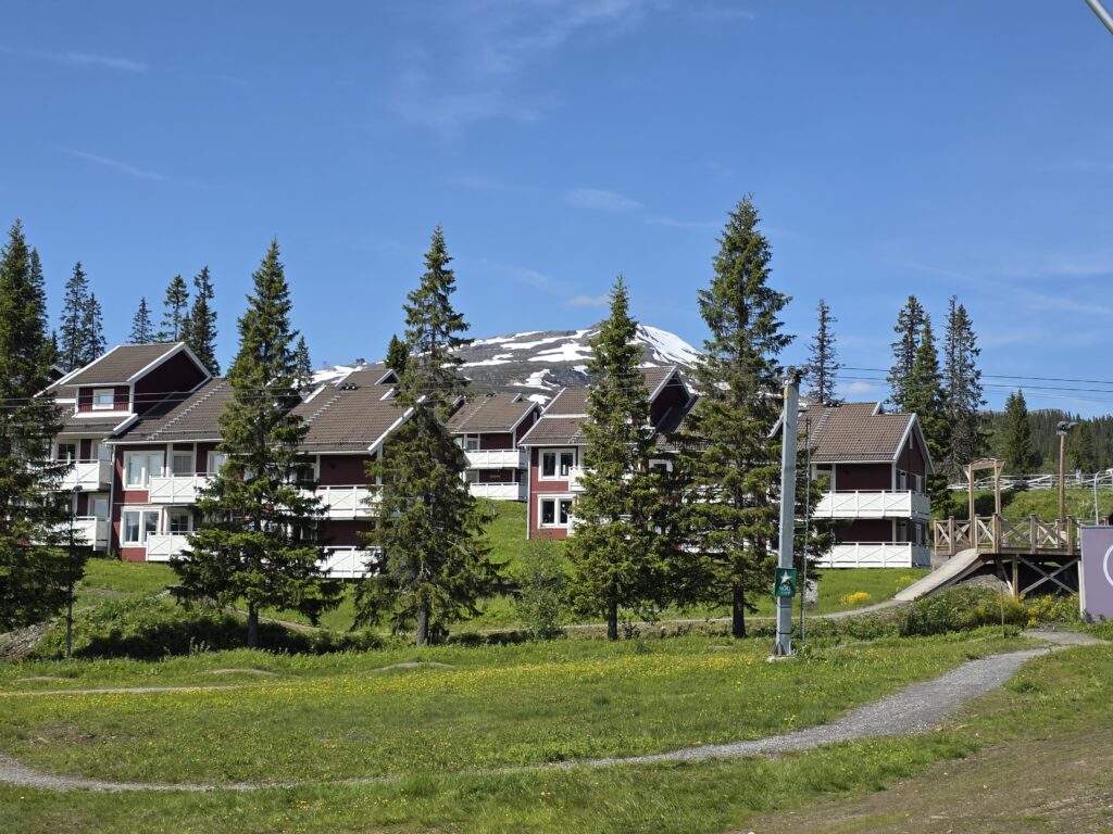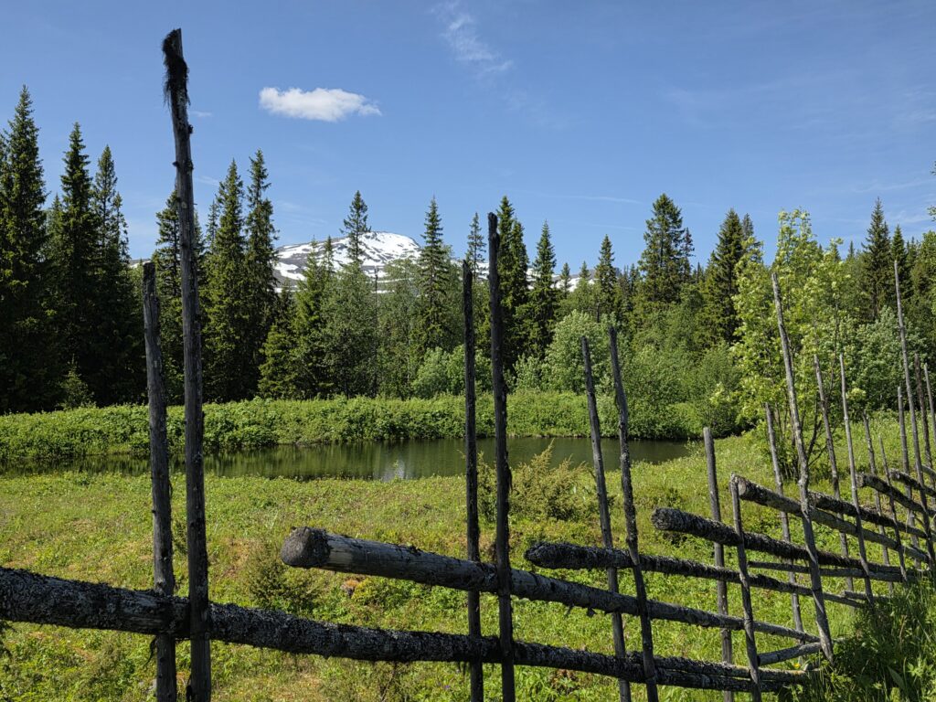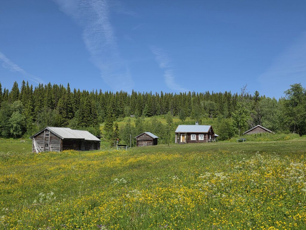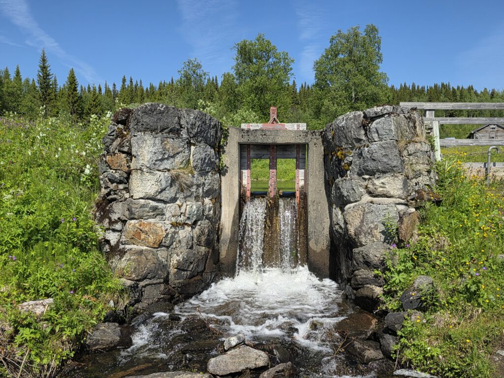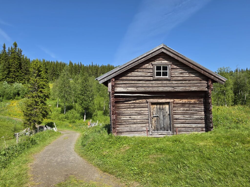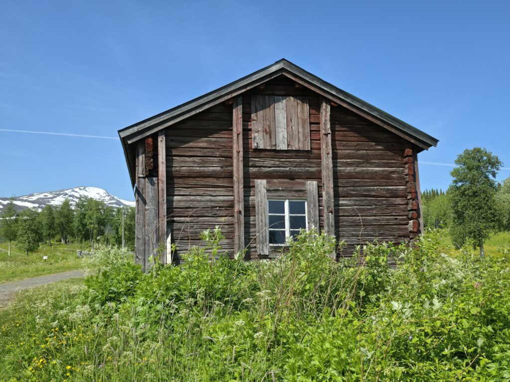 Vi svingte av fra E 14 ved Björnänge. Åre-Bjørnen heter dette skianlegget. Det lå langs veien inn til Fruå gruve. Fjellet i bakgrunnen heter Åreskutan. Toppen rager 1420 meter over havet. Det går gondolbane nesten helt til topps. Sveriges høyest beliggende kafé, Toppstugan befinner seg på toppen av ÅreskutanDen lange rørformede vannkanalen av tre kalles for en tretub. Den ledet vannet fra elva Fröån til gruvens vanndrevne maskinsystem. Vannet fra tretuben ble brukt til å drive et gigantisk vannhjulVannet ble ledet inn i vannhjulsbygningen. Inne i dette huset står det nå et stort vannhjul. Det har en diameter på 9,5 meter. I 1859, da hjulet ble konstruert var det to slike vannhjul i bygningen. Det ene drev lensepumper i Dronninggruven, det andre heiser i gruvesjaktene. Vannhjulene var i bruk til 1916 da elektriske kraftløsninger overtok jobbenEt sinnrikt energioverføringssystem, den 200 meter lange stanggangen mellom vannhjulshuset og pumpehusetKraften fra vannhjulet ble overført til en 200 meter lang stanggang. Stanggangen var en slags «kraftledning» av tre og jern. Bevegelsen i stanggangen ble overført til pumper eller blåsebelger. Legg merke til ansamlingen av de verdiløse steinmassene som på svensk kalles «gråberg». Gråberget inneholdt normalt 2-3 prosent kobber. I disse steinene er det nok fortsatt en kvart prosent med gjenværende kobberStanggangen endte i dette pumpehuset. Alt vann fra gruvene samlet seg på 90 meters dyp i Dronningsjakten under pumpehuset. Dronningsjakten var oppkalt etter Sofia Magdalena, kona til kong Gustav 3. Dronningsjakten sto i forbindelse med de andre gangene i gruva. Fra sjakta ble vannet pumpet opp fra gruvegangene. Historien vil ha det til at klokkene i Åre gamle kirke en gang ble fraktet opp til gruvene. Baktanken med det var at den intense klangen fra klokkene skulle skremme onde makter ut av gruvegangeneEi av smiene på bruket. I bakgrunnen den spesielle bygningen PivånFlotte omgivelser ved Frøå gruveRaststugan er en av de eldste bygningene på bruket. Den ble bygget på 1770-tallet. Bygningen ble opp gjennom årene brukt til ulike formål. Som butikk tidlig på 1900-tallet, som matsal for arbeiderne og som skolestueI forbindelse med nysatsingen tidlig på 1900-tallet bygget den svenske staten et hotell på Frøå. Hotellet sto ferdig i 1913. Bygningen med flere etasjer huset prominente gjester som ingeniører, geologer, arbeidsledere og andre spesialister. Hotellet hadde den gang nymoderne fasiliteter som strøm, rennende vann, elektrisitet, vannklosett og telefon. Hotellet rommet også postkontor, skolerom og matsal for arbeidere. Da bedriften gikk konkurs ble byggningen plukket fra hverandre og solgt på auksjonArbeidsfolkene på FrøåPivån ble oppført på 1860-tallet. Bygningen hadde åtte sider og flere hensiktsmessige vinduer. I Pivån fantes et maskineri for omkobling av stålkabler som ble brukt til å heise malm fra gruvene. I Pivån fikk stålkablene ny retning ut til de ulike gruvesjaktene der oppgaven var å dra malmvogner eller heise malmtønner. Energien til arbeidet ble levert av vannkraften som drev vannhjuleneKaffi og vafler i solveggen på Bergstua. I gamle dager var det langt til arbeidsplassen. Gruveselskapet bygget et overnattingsbygg for ukependlere. Det var bergstuer både i Frøå og på Huså. Bergstua på Frøa ble revet i 1920. Det nye bergstuebygget fra 1990 fungerer nå som restaurantHusmannsplassen Sellstedstorpet var den siste permanente bosetningen på Frøa. Sellstedstorpet var bosatt fram til 1971 av søskenparet Lars og Alma. Da Lars døde flyttet Alma på eldrehjemRundt år 1850 bodde om lag 600 personer med familie på gruveselskapets eiendommer. Småbrukene huset flere hundre kyr, sauer og og geiter. Det pågikk selvbergning til egen hushold. Høy som vinterfôr til dyra og den viktige poteten til menneskene. Tilgangen på korn var heller dårlig. I vanskelige tider (uår) hjalp gruveselskapet de ansatte med billig korn. Totalt sett var det rundt 120 bebodde småbruk på Huså og Frøå. 17 av småbrukene lå ved Fröå gruveDet er gode muligheter for fjellvandring i området. Mange av de som besøkte Bergstua og Frøå var fotturister. Her passerer stien SellstedstorpetDen gamle torpstugan på Sellstedstorpet. Huset er sannsynligvis fra 1820-tallet. Gruvearbeiderne fikk muligheten til å leie et lite jordstykke. Gruveselskapet bidro gjerne med hjelp til byggingen av husene på småbruket. Dette som et ledd i datidens personalpolitikk. Det var viktig å trekke gode arbeidsfolk til gruveneFröåtjärn var en viktig del av vannsystemet på Frøå. Vann fra elva ble ledet til tjernet slik at Frøå gruve hadde et bufferlager av vann i perioder med lav tilgang på vann. Fra Fröåtjärn ble vannet ledet via tretuben til de store vannhjuleneDen rørformede trekanalen, tretuben, ledet vannet fra tjernet til vannhjulene. Föreningen Fröå Gruvor ble stiftet i 1984. Foreningen drifter i dag området. Målsetningen er å bevare de tekniske innretningene, redskapene, bygningene og kulturhistorien til gruven og området. Åre kommune eier arealet i Fröå-området.Overskuddsvann fra Frøåtjern