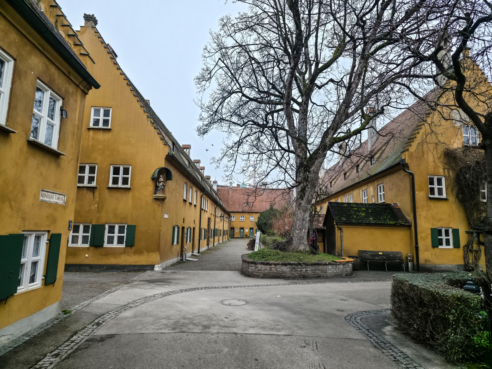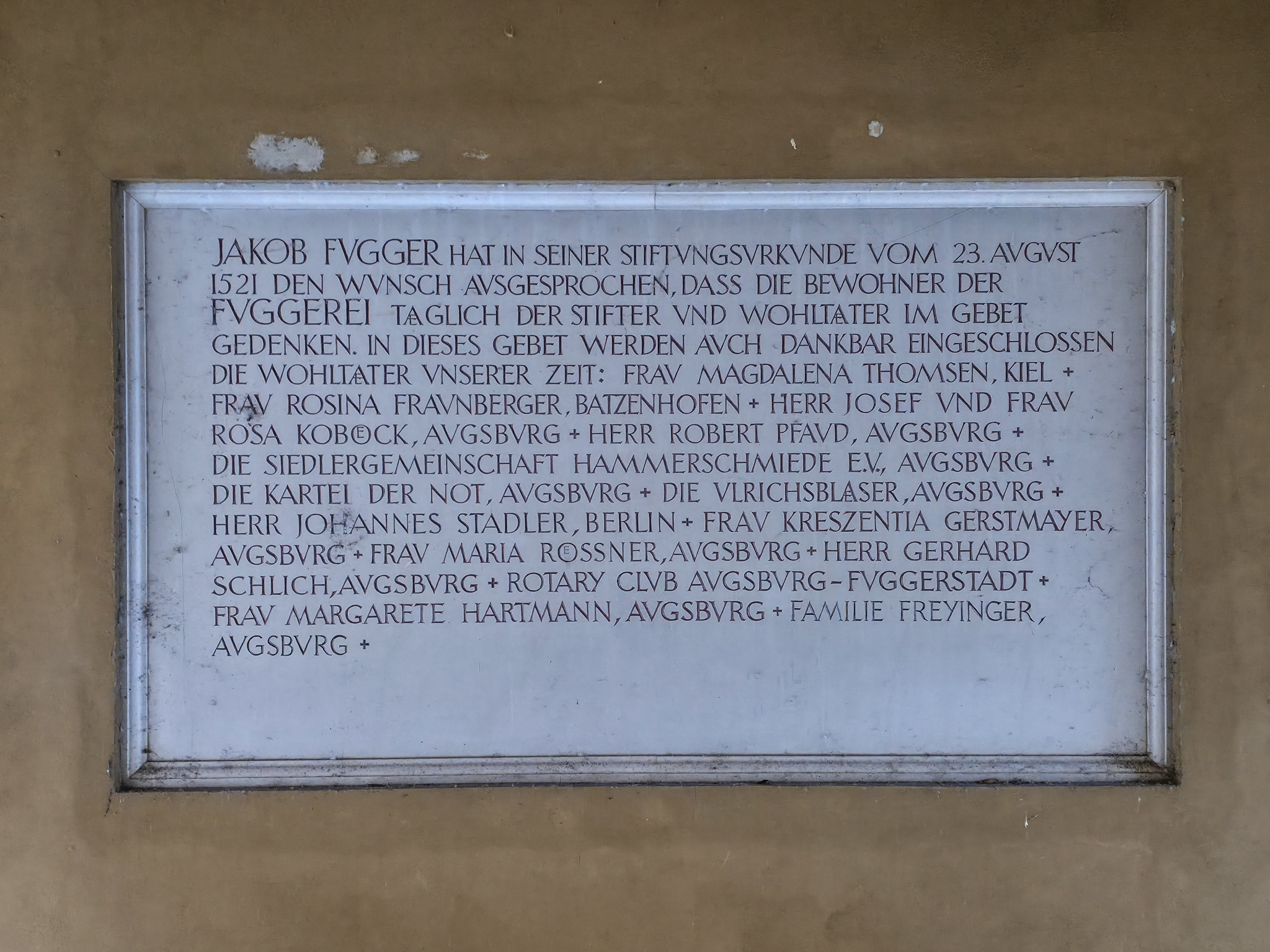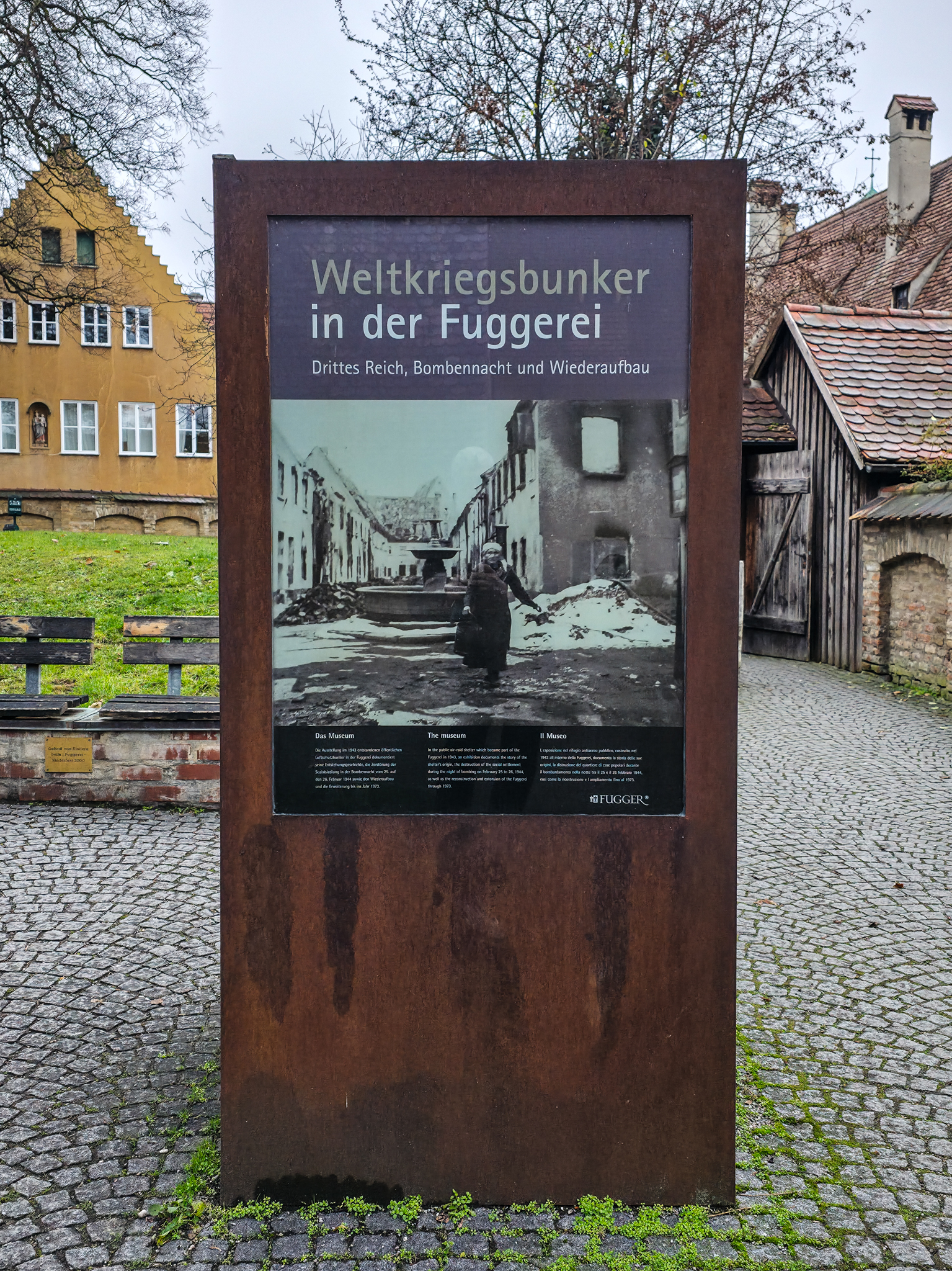 Området nær det offisielle inngangspartiet i FuggerreiPlaketten på veggen markerer Fuggereis offisielle stiftelsesdato, 23. august 1521. Denne dagen undertegnet Jakob Fugger dokumentet som etablerte Fuggerei som en stiftelse for all framtid. Målet var å gi fattige katolikker i Augsburg et verdig sted å bo, og tiltaket ble sett på som en kristen handling som kunne bidra til frelse. Siden Jakob Fugger ikke hadde egne livsarvinger, ble dokumentet både signert og beseglet av ham selv og nevøene Ulrich, Hieronymus og RaymundAugsburg var en av de mest folkerike byene i Det hellige romerske riket. I 1521 hadde byen rundt 30 000 innbyggere, en befolkning som spente fra tiggere, dagarbeidere og tjenere til håndverkere, handelsmenn og byens elite. Hele tretti prosent av innbyggerne var knyttet til vevindustrien, byens viktigste næringer. På denne tiden bodde det omkring 300–350 mennesker i Fuggerei. Bildet henger i Fuggerei-museet i AugsburgI 1521 ble også Augsburg rammet av pest. Det påfølgende året opprettet byen et eget almissekontor for å hjelpe fattige innbyggere. Tigging ble regulert, og det ble en kommunal oppgave å ta vare på dem som falt utenfor samfunnet. Bildet henger i Fuggerei-museet i AugsburgJakob Fugger, rikmannen som ønsket å dele noe av den enorme formuen han forvaltet med byens fattige, er hedret med en bronsestatue i Fuggerei‑parken. Skulpturen er laget av kunstneren Hans LadnerI dag bor det rundt 150 mennesker i de 67 bygningene i Fuggerei, både par, enslige og familier. For å få bolig her må man ha bodd minst to år i Augsburg og være medlem av den katolske kirken. Den årlige leiesummen er som på 1520-tallet, én rhinsk gylden i året, tilsvarende mindre enn en euro i dagens valutaFuggerliljen er familieemblemet til den viktigste delen Fugger‑slekten. Det har vært brukt siden middelalderen. Symbolet består ofte av ei gullfarget lilje på blå bakgrunn. Emblemet fungerte som markør for familiens sterke posisjon i Augsburg kan idag fortsatt sees på flere bygninger i FuggereiFlott arkitekturOchsen Gasse er navnet på en av de åtte gatene i Fuggerei. Gaten munner ut ved porten Ochsentor, den eneste av de sju bydelsportene som holdes åpen etter klokken 22.00. Her slipper portvakten beboerne inn eller ut mot en symbolsk pengesumFuggerei tiltrekker seg flere hundre tusen turister hvert år, og besøkende fra hele verden bidrar til rundt en tredel av inntektene som trengs for å drifte anlegget. Beboerne la stor vekt på å holde området ryddig og velsteltMange av bygningene har sin egen lille hellige «beskytter» i en nisje på veggenInformasjonstavlen skjuler nedgangen til en godt bevart underjordisk bunker. Den ble bygget i 1943 for å beskytte Fuggereis beboere under de alliertes luftangrep. Da Augsburg ble bombet i februar 1944, søkte rundt 200 mennesker tilflukt her. I dag huser bunkeren en utstilling som skildrer ødeleggelsene og den senere gjenoppbyggingen av FuggereiMetallindustrien og våpenproduksjonen fikk stor betydning for Augsburg i årene før krigen. Fram til 1945 produserte Messerschmitt-konsernet rundt 35 000 ME 109-kampfly ved fabrikker i Augsburg og andre tyske byer. Den allierte bombingen natt til 26. februar 1944 rammet Augsburg med voldsom kraft. Store deler av sentrumskjernen ble jevnet med jorden, 730 mennesker mistet livet, og minst to tredeler av Fuggerei ble ødelagt. Bare få dager senere besluttet innbyggerne og ledelsen i Fuggerei at bydelen skulle gjenreises. Bildet henger i Fuggerei-museet i AugsburgWeltkriegesbunker med museum i FuggerreiRundturen går mot slutten. Vi beveger oss nedover mot hovedinngangen og MarkuskircheMarkuskirche ligger inne i Fuggerrei. Kirken ble bygget på begynnelsen av 1580-talletMarkuskirche ble bombet 25.februar 1944. Kirkebygget ble gjenreist i etterkant av krigen. Fuggerslekten bidro med midler til gjenoppbyggingen Kirken er enkel i formen, men rik på symbolikk. Fuggerei var ikke bare et sosialt prosjekt, men også et uttrykk for kristen nestekjærlighetI de laveste sosiale sjiktene var grensene mellom fattige og nødlidende ofte flytende. Selv mennesker som hadde arbeid, kunne leve i dyp nød. Da Fuggerei ble opprettet, var et av hovedmålene å hjelpe de «skjulte fattige», arbeidsføre personer som likevel ikke klarte å forsørge seg selv. Dette var folk som ønsket å klare seg uten å tigge, men som trengte et trygt og verdig sted å boFranz Mozart, som var murer av yrke og oldefar til Wolfgang Amadeus Mozart, bodde i flere år i Mittlere Gasse 14 i Fuggerei. Han er i dag en av de mest kjente beboerne fra bydelenFuggerei har et gjennomført og harmonisk uttrykk. De gule bygningene med grønne dører og vindusskodder gir området et varmt og særpreget uttrykk. Mange av husene er dessuten delvis dekket av klatreplanterAdministrasjonsbygningen i Fuggerei fungerer som møteplass for Fugger‑stiftelsen. Her samles representanter for de tre gjenlevende grenene av Fugger‑familien til sine møter. I 1950 ble Hochstetter Oriel, et lite, utspringende karnappvindu, satt opp på fasaden. Karnappet er et dekorativt innslag i den ellers så enkle arkitekturen i FuggereiMarkusbrunnen på Jakobsplatz. En av flere innganger til Fuggerrei skimtes i bakgrunnen
