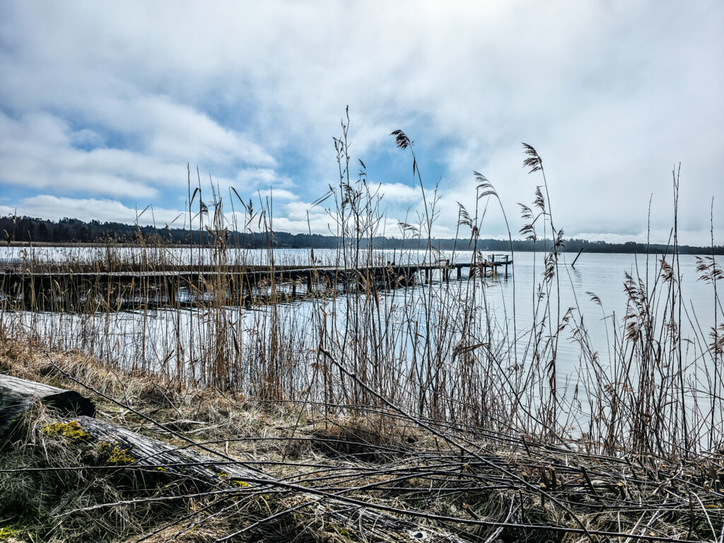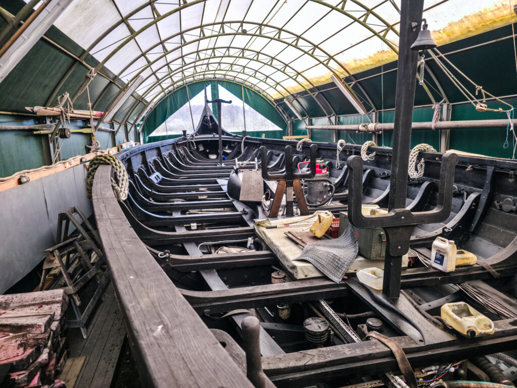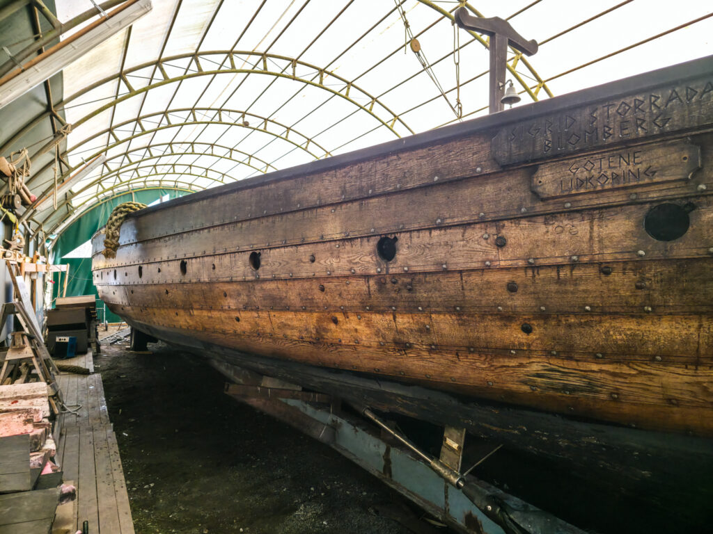 Om sommeren ligger skipet på innsjøen. Da vi besøkte Blomberg var det fortsatt tidlig på våren. Sigrid Storråde lå forstatt innendørs i vinteropplag