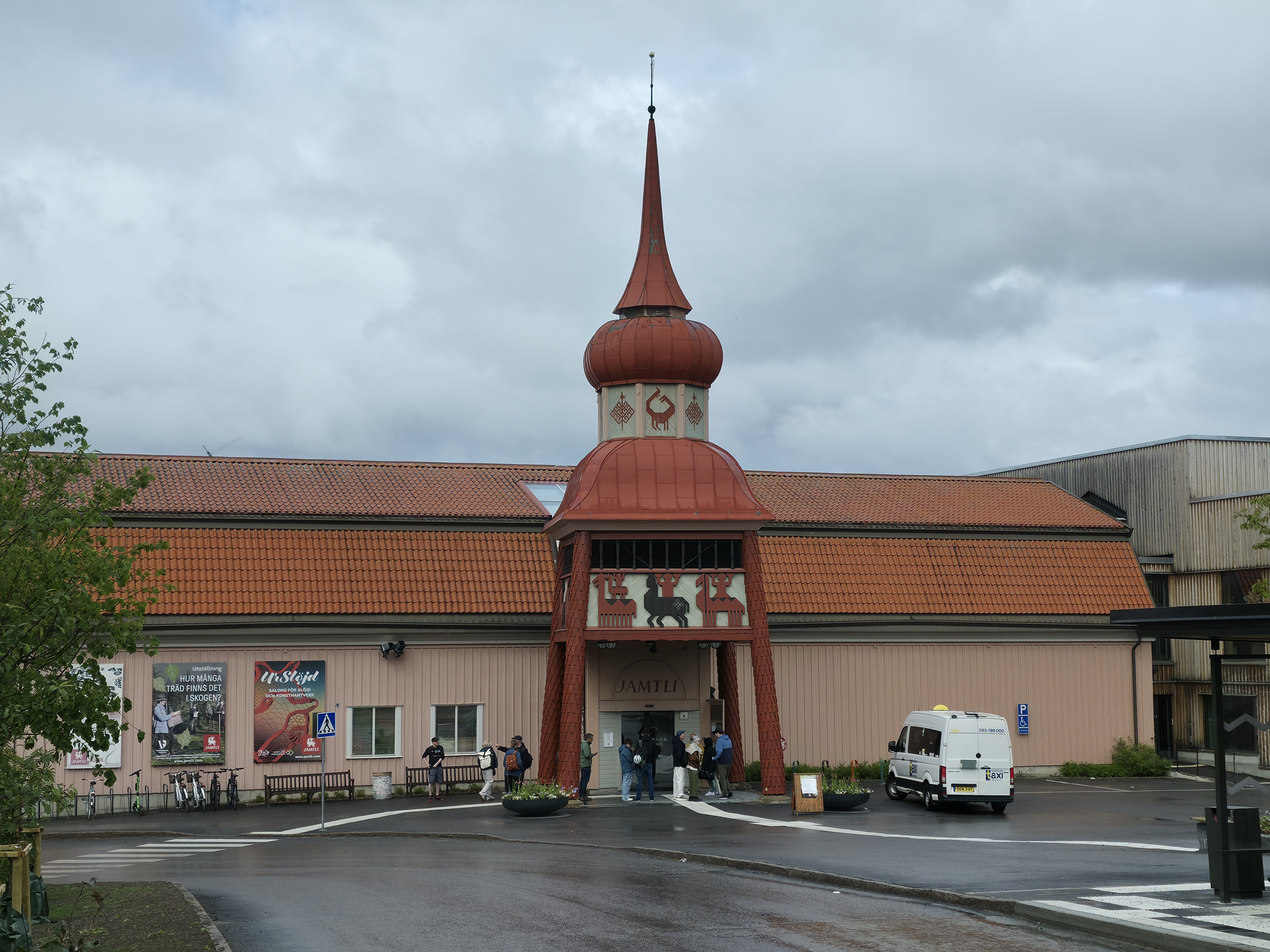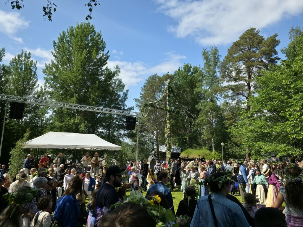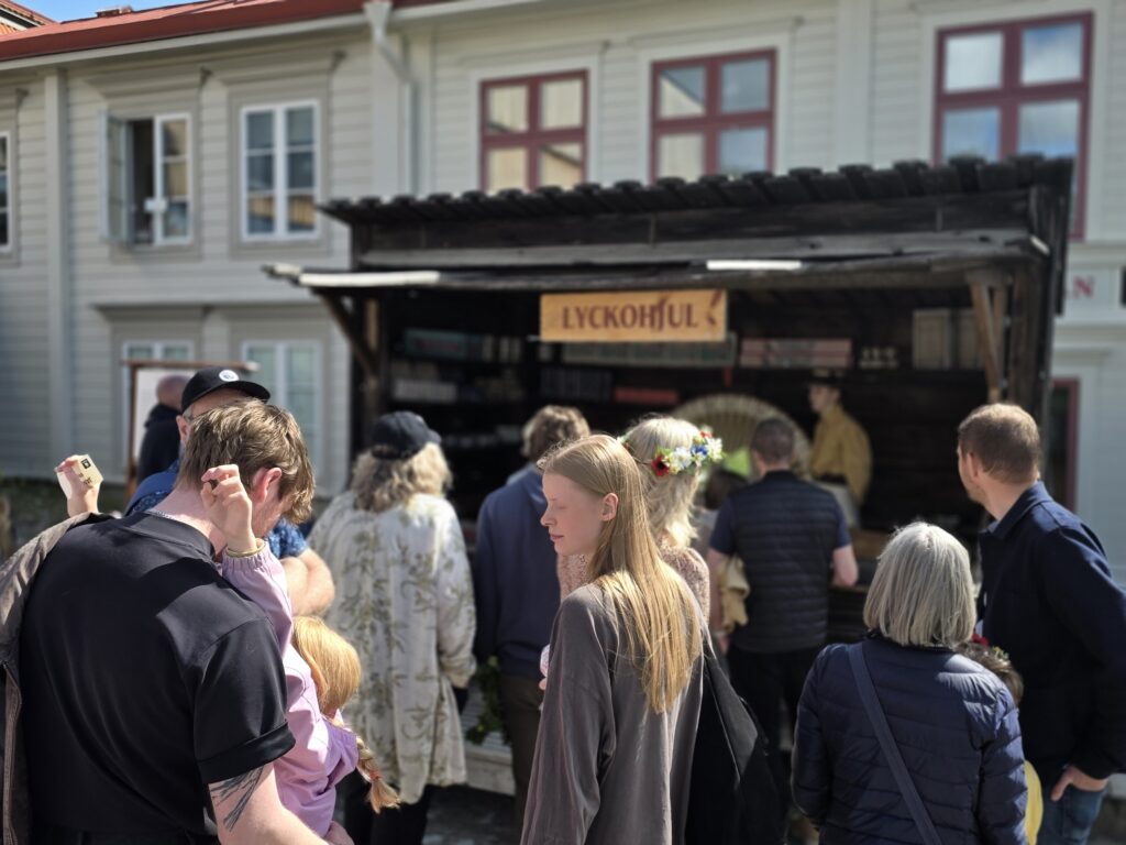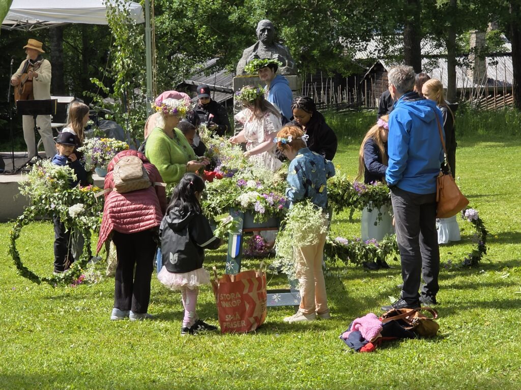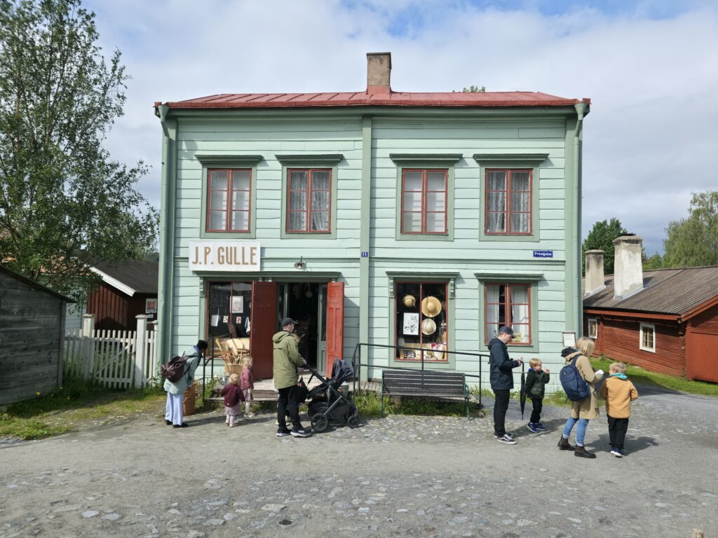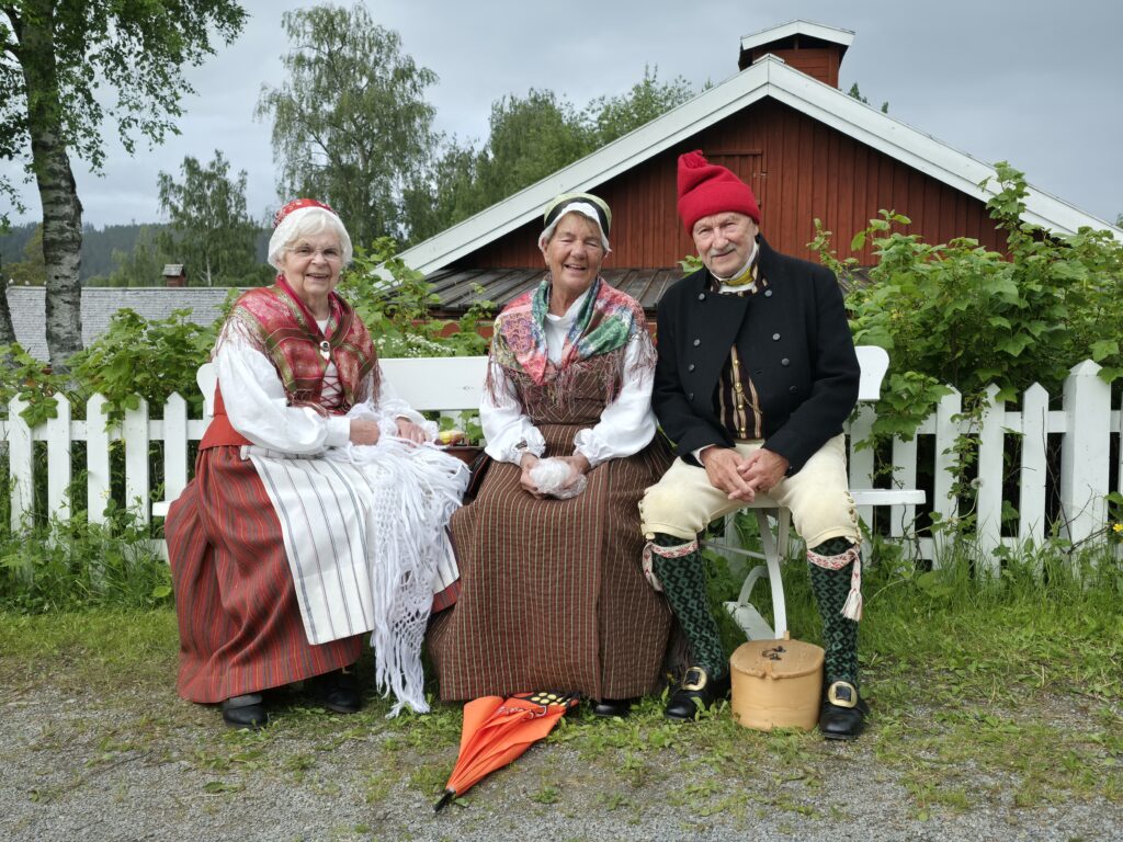 Dagen startet med regn og gråvær, men etter hvert kom sola framJ.P. Gulle-huset på Jamtli er en rekonstruert diversehandel fra 1895, og gir et levende innblikk i bylivet i Östersund på slutten av 1800-tallet. Huset er oppkalt etter kjøpmann Johan Petter GulleDe ansatte stilte smilende opp i tidsriktige kostymerLang kø for å få prøve det gammeldagse lykkehjuletUlike svenske bunaderKonsumbussen er fra 1950-tallet. Bussen var en rullende butikk som brakte varer og nyheter ut til bygdene i Jämtland. Den var i bruk i en tid da bilismen ennå ikke var utbredt og mange småbutikker ble lagt ned. Behovet for mobile tjenester ble dermed stortEsso-stasjonen er fra 1950-tallet, komplett med tidsriktige pumper, reklameskilt og interiørJamtli vartet både opp med tradisjonell folkemusikk og kjente svenske sanger De mer enn tusen år gamle Överhogdalsbonaderna er gjerne museets viktigste og mest verdifulle gjenstand. Tekstilene gir oss et innblikk i vikingtidens verdensbildeMotiver og symbolikk vekker fortsatt debatt. Enkelte er av den oppfatning at motivene skildrer kristningen av Härjedalen, mens andre ser dem som en framstilling av Ragnarok, verdens undergang i norrøn mytologi.De samiske jemtene har flokket seg rundt et nedfelt reinsdyr. Jämtland tilhører det sørsamiske området. I Jämtland finnes det flere samebyerMuseet har også en imponerende samling av historiske gjenstander og kunstverk. Her en jemtsk bonde som snart skal reise ut for å bytte varer med bønder på den norske siden av grensenDette gamle tinghuset kom opprinnelig fra Gärde i BrunfloVed Hammerdal kirke fantes det for hundre år siden rundt to hundre kirkestuer og staller. Folk som skulle besøke kirken kom gjerne langveisfra, og trengte hvile og overnatting før kirkebesøket. Dette bygget som er fra midten av 1800-tallet inneholder både stall og stueNostalgi og idyll i finværetI Sverige er det sterke tradisjoner knyttet til feiring av midtsommer. Jamtli i Östersund er det mest populære stedene i Jämtland for å feire midtsommer både for lokalbefolkningen og besøkendeHer bindes blomster på maistangenMidtsommeraften faller alltid på fredag mellom 19. og 25. juni. Den påfølgende lørdagen kalles midtsommerdag. Da holder de fleste butikkene stengt. Folk feirer hjemme eller i stugan (hytta). Vanlig midtsommermat er grillmat, kalvestek og sommersildMidtsommerstangen eller maistangen som den gjerne også kalles dekkes helt med løv og blomster. Maistangen er formet som et kors med to hengende ringer. Midtsommerfeiringen var opprinnelig knyttet til feiring av naturen og ønske om gode avlingerBlomsterkransen er bundet, og vi er klare for midtsommerfeiringMidtsommerstangen er på vei opp. Etterpå var det barnesanger og ringdans rundt stangenEn fin sommerdag er på hell. Orkesteret spiller kjente og ukjente sanger fra scenen mens lange rekker av feststemte mennesker danset og sang