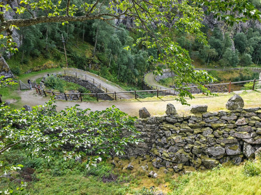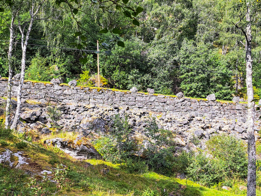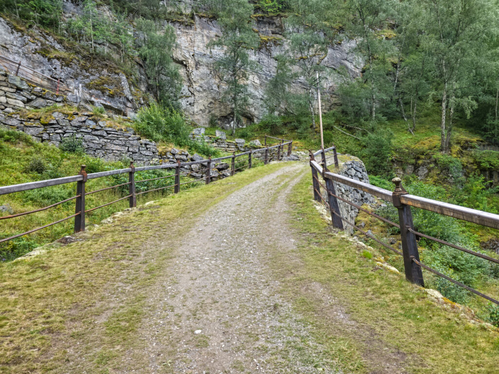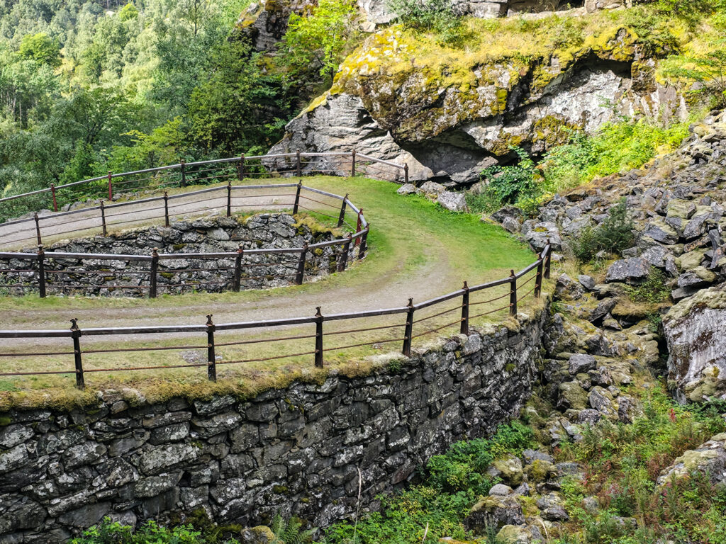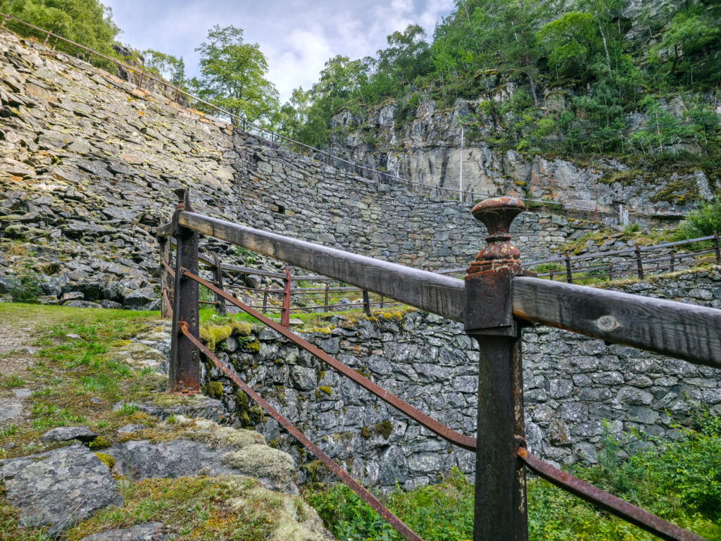 Mye av veien er lagt på kraftige murer av naturstein. Det flotte rekkverket i støpejern ble i sin tid laget på Eidsvoll Verk